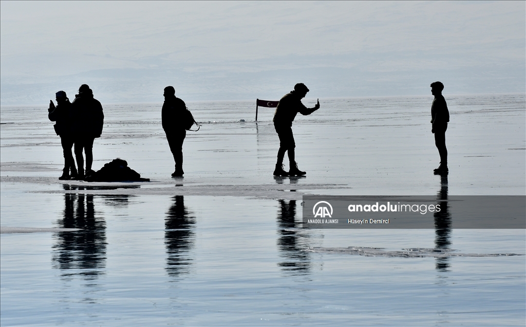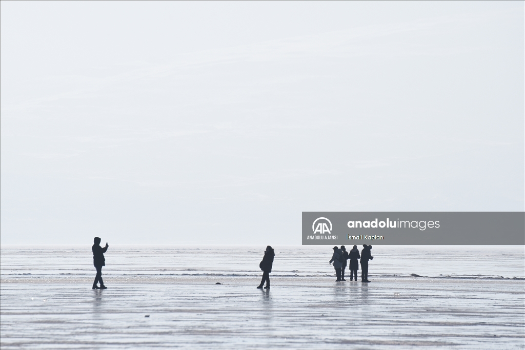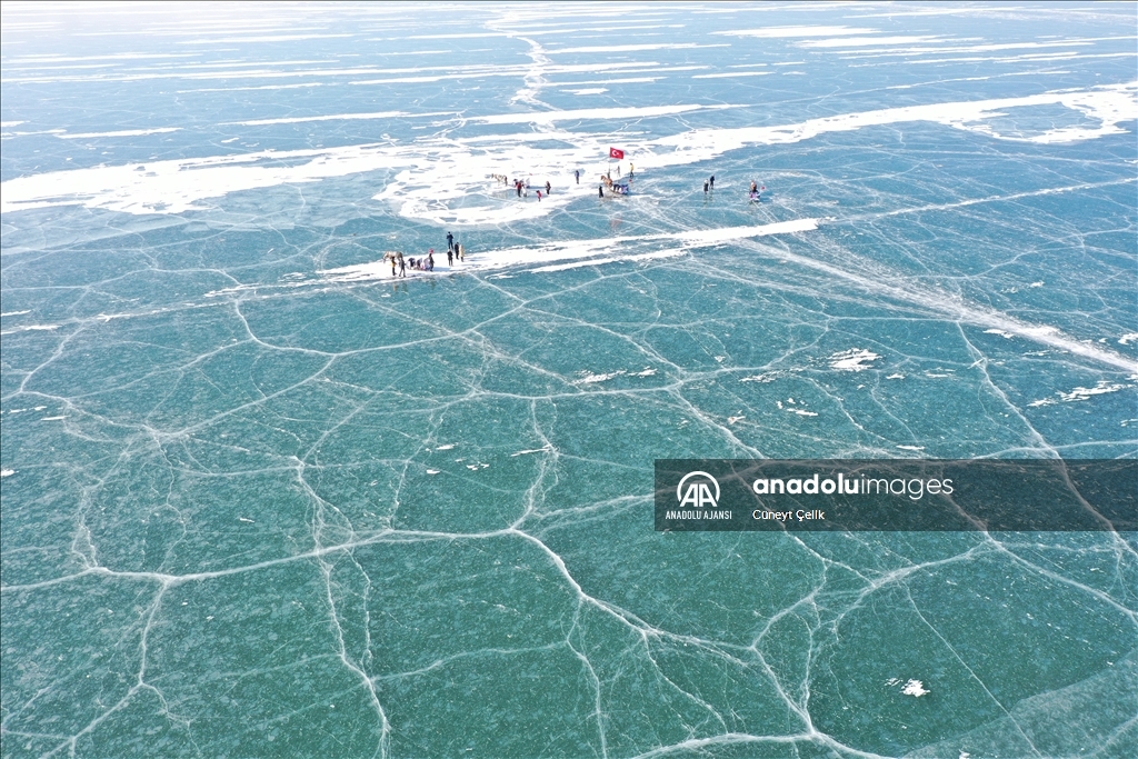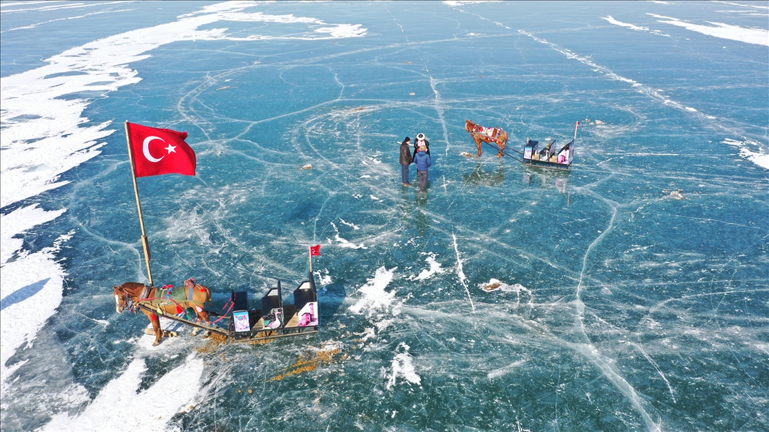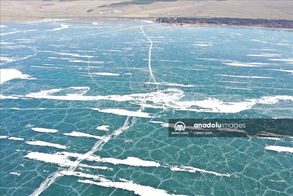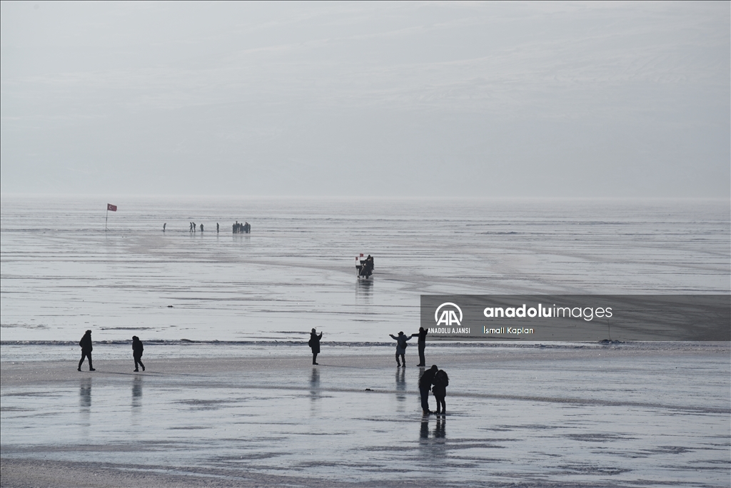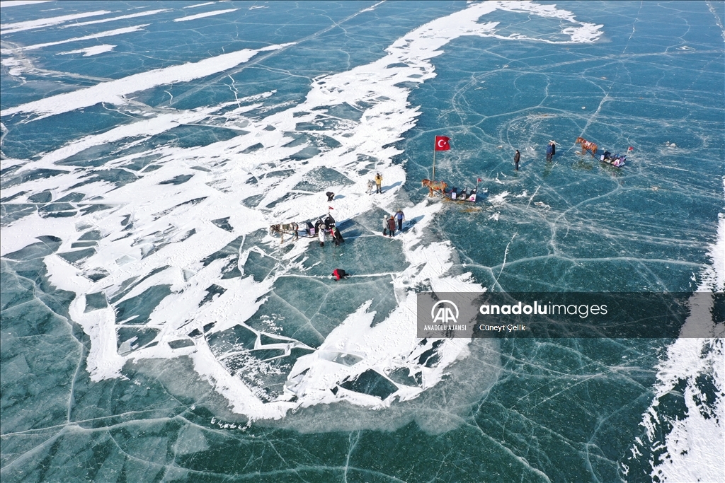 Turistlerin kış seyahat rotaları arasında yer alan buzla kaplı Çıldır Gölü'nün cazibesi her geçen gün artıyor. ( Hüseyin Demirci - Anadolu Ajansı )Hüseyin Demirci