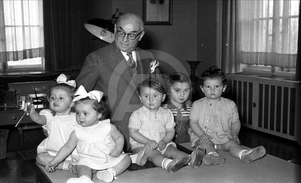 Türkiye'nin üçüncü Cumhurbaşkanı Celal Bayar, milli mücadele yıllarında önemli bir rol alarak "Galip Hoca" takma adıyla ülkenin işgalini engellemek için halkı bilinçlendirirken, çok partili siyasi yaşamın ilk sivil cumhurbaşkanı sıfatıyla da demokratikleşme ve özgürleşme alanında önemli çalışmalara imza attı. Türkiye'nin ilk sivil Cumhurbaşkanı Bayar'ın vefatının üzerinden 33 yıl geçti. 1 Ocak 1951'de Cumhurbaşkanı Bayar, torunları Akile ve Emine (kurdeleli olanlar) ile Çankaya Köşkü'nde. (Arşiv)
