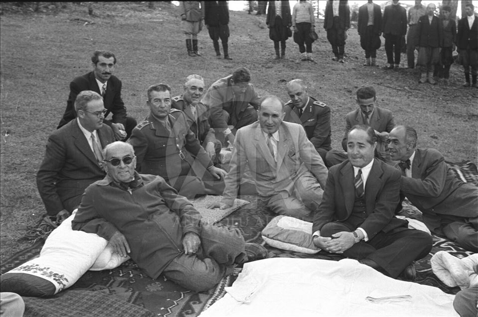 Türkiye'nin üçüncü Cumhurbaşkanı Celal Bayar, milli mücadele yıllarında önemli bir rol alarak "Galip Hoca" takma adıyla ülkenin işgalini engellemek için halkı bilinçlendirirken, çok partili siyasi yaşamın ilk sivil cumhurbaşkanı sıfatıyla da demokratikleşme ve özgürleşme alanında önemli çalışmalara imza attı. Türkiye'nin ilk sivil Cumhurbaşkanı Bayar'ın vefatının üzerinden 33 yıl geçti. 30 Eylül 1952'de Cumhurbaşkanı Bayar (solda), Doğu Anadolu gezisinde bir dinlenme sırasında. (Arşiv)