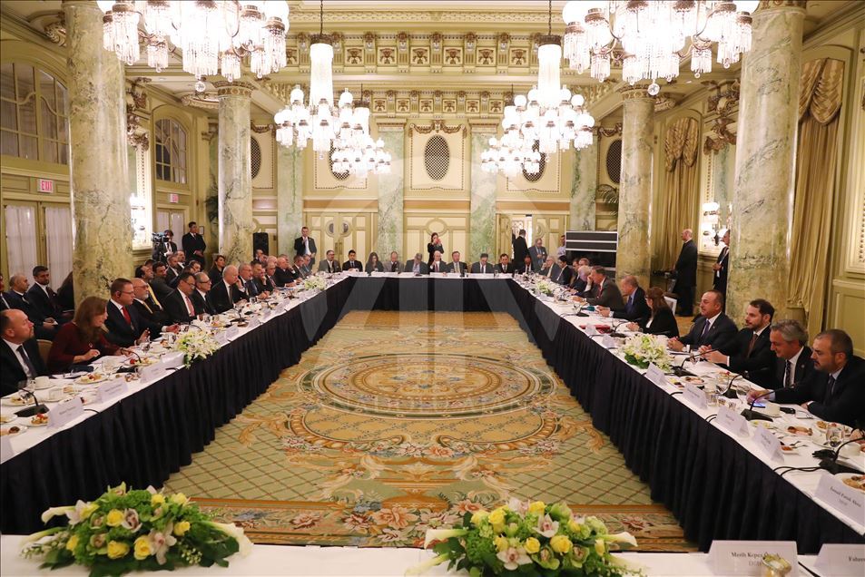 Türkiye Cumhurbaşkanı Recep Tayyip Erdoğan, ABD Başkanı Donald Trump'ın daveti üzerine çalışma ziyareti gerçekleştirmek için geldiği Washington'da, ABD'li iş insanları ile bir araya geldi. ( Cumhurbaşkanlığı / Murat Çetinmühürdar - Anadolu Ajansı )Cumhurbaşkanlığı / Murat Çetinmühürdar