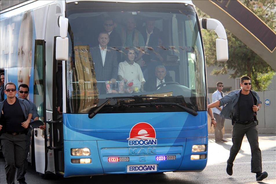 Beraberinde eşi Emine Erdoğan ile Diyarbakır'a gelen Cumhurbaşkanı adayı ve Başbakan Recep Tayyip Erdoğan seçim otobüsü ile miting alanına geçti. (Özgür Ayaydın - Anadolu Ajansı)Özgür Ayaydın