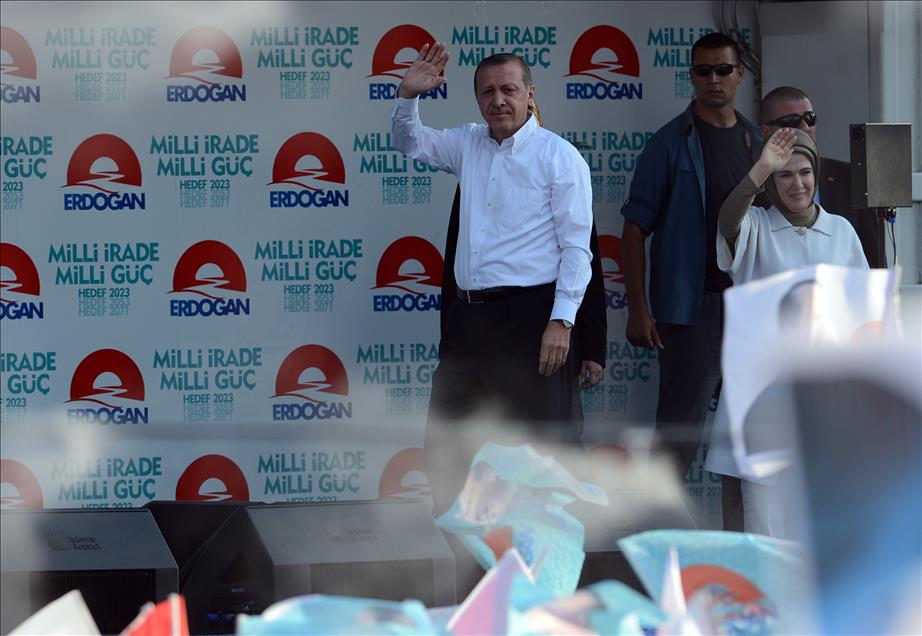 Cumhurbaşkanı adayı ve Başbakan Recep Tayyip Erdoğan eşi Emine Erdoğan ile Diyarbakır İstasyon Meydanı'nda düzenlenen mitinge katıldı. (Hüseyin Bağış - Anadolu Ajansı)Hüseyin Bağış