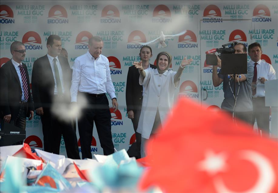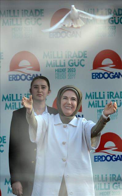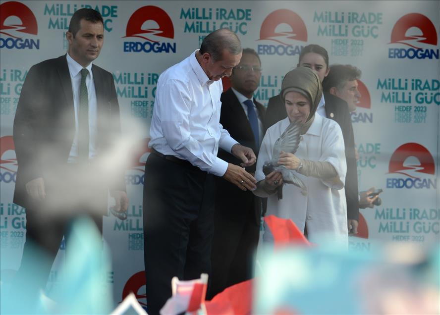 Cumhurbaşkanı adayı ve Başbakan Recep Tayyip Erdoğan eşi Emine Erdoğan ile Diyarbakır İstasyon Meydanı'nda düzenlenen mitinge katıldı. Emine Erdoğan, mitingde güvercin uçurdu. (Hüseyin Bağış - Anadolu Ajansı)Hüseyin Bağış