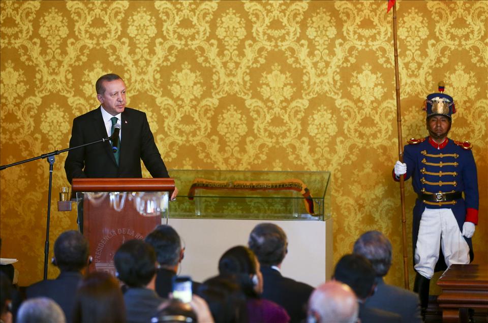 Resmi ziyaret için Ekvador’da bulunan Cumhurbaşkanı Recep Tayyip Erdoğan, Ekvador Devlet Başkanı Rafael Correa ile Carondelet Başkanlık Sarayı’nda basın toplantısı düzenledi. ( Kayhan Özer - Anadolu Ajansı )Kayhan Özer