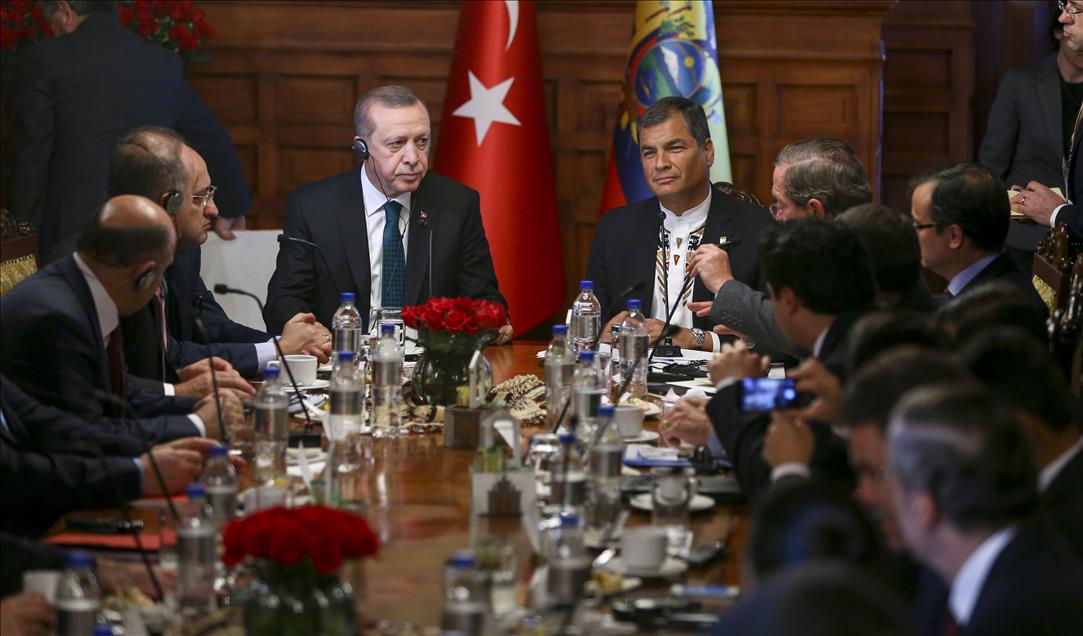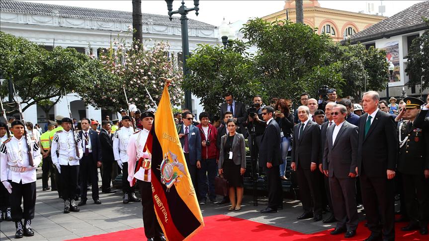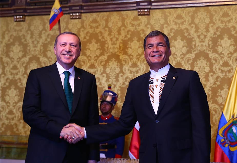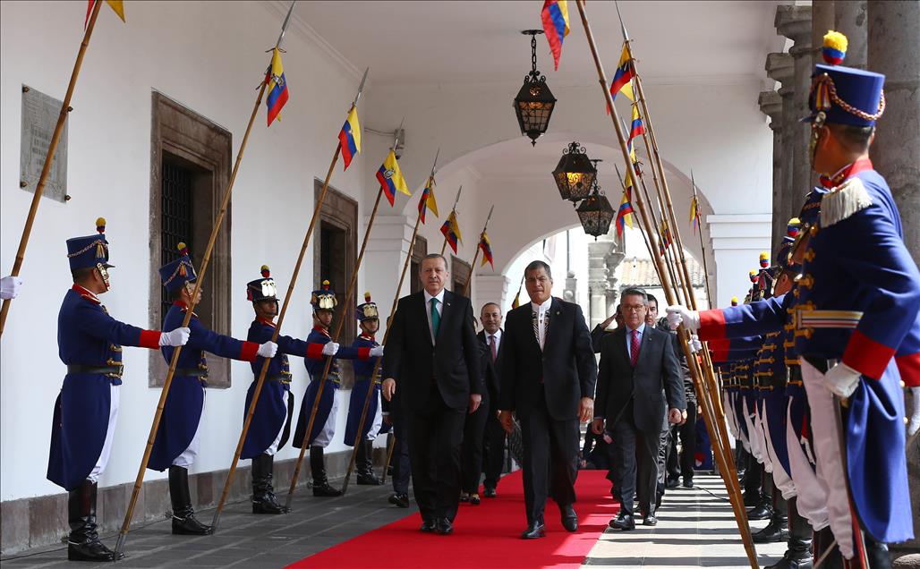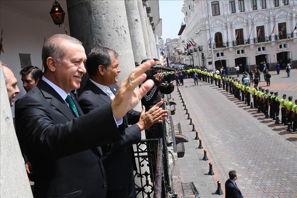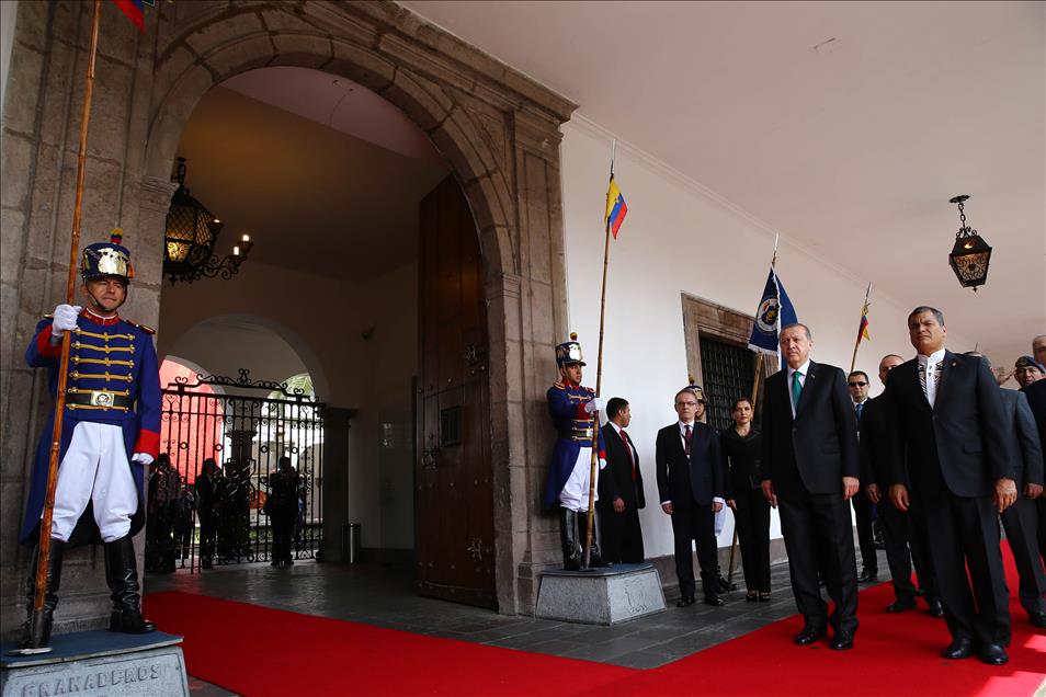 Cumhurbaşkanı Recep Tayyip Erdoğan, Ekvador Devlet Başkanı Rafael Correa tarafından resmi törenle karşılandı. Erdoğan ve Correa heyetler arası görüşmelere başkanlık etti. Görüşmelere Başbakan Yardımcısı Yalçın Akdoğan, Dışişleri Bakanı Mevlüt Çavuşoğlu, Bilim, Sanayi ve Teknoloji Bakanı Fikri Işık, Ekonomi Bakanı Mustafa Elitaş, Enerji ve Tabii Kaynaklar Bakanı Berat Albayrak da katıldı. ( Ahmet İzgi - Anadolu Ajansı )Ahmet İzgi