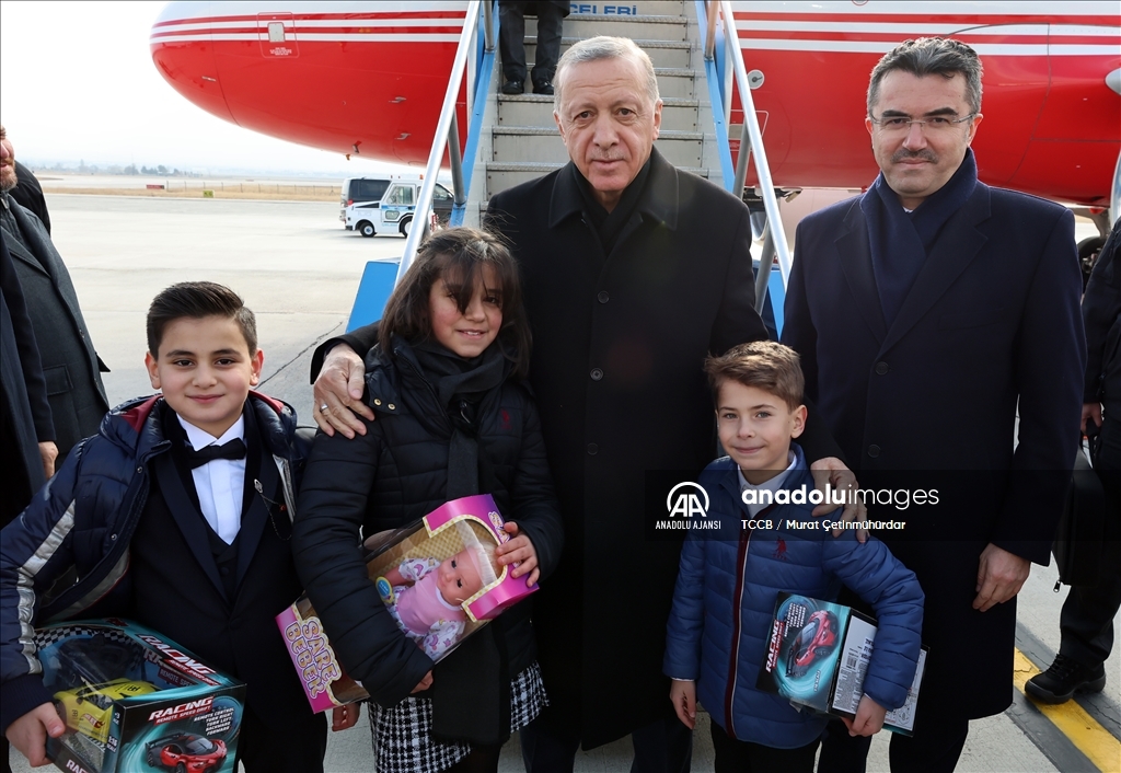 Cumhurbaşkanı Recep Tayyip Erdoğan, Gürcükapı Kentsel Dönüşüm Projesi, İspir-Rize İl Sınırı Yolu ve Çat Afet Konutları ile yapımı tamamlanan diğer projelerin toplu açılış törenine katılmak üzere Erzurum'a geldi. Erdoğan, kendisini karşılayanlar arasında bulunan çocuklarla sohbet etti. ( TCCB / Murat Çetinmühürdar - Anadolu Ajansı )TCCB / Murat Çetinmühürdar