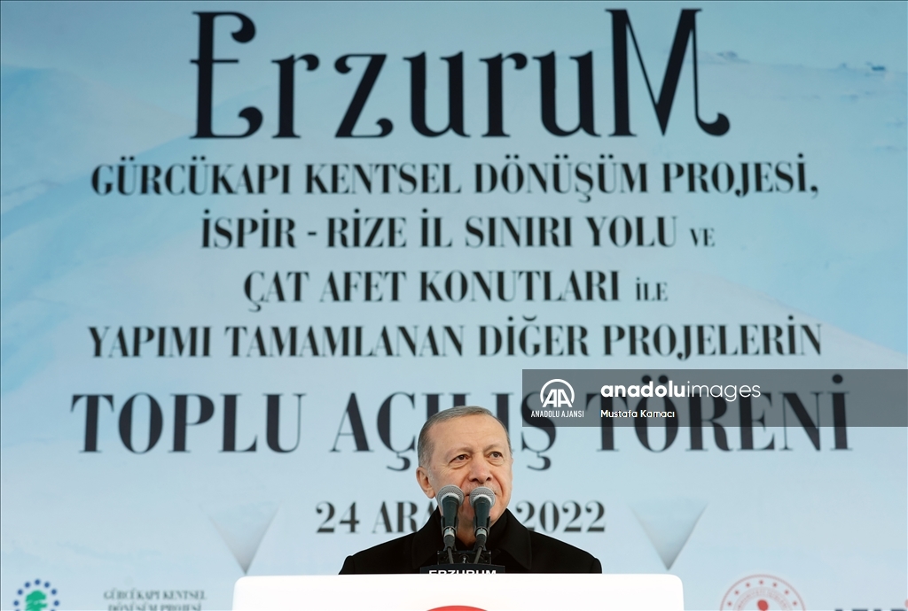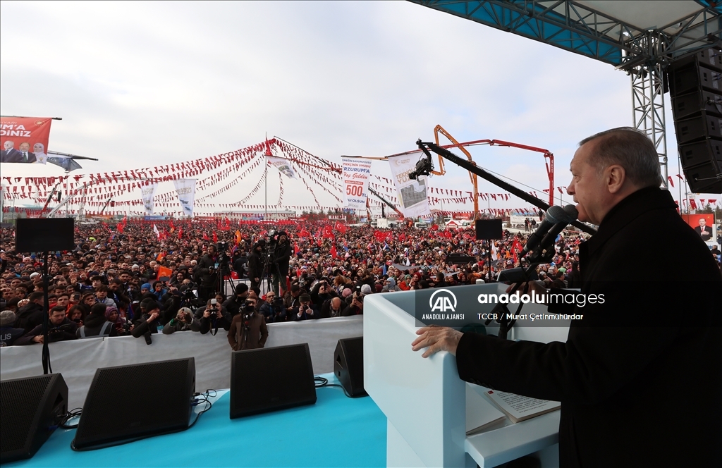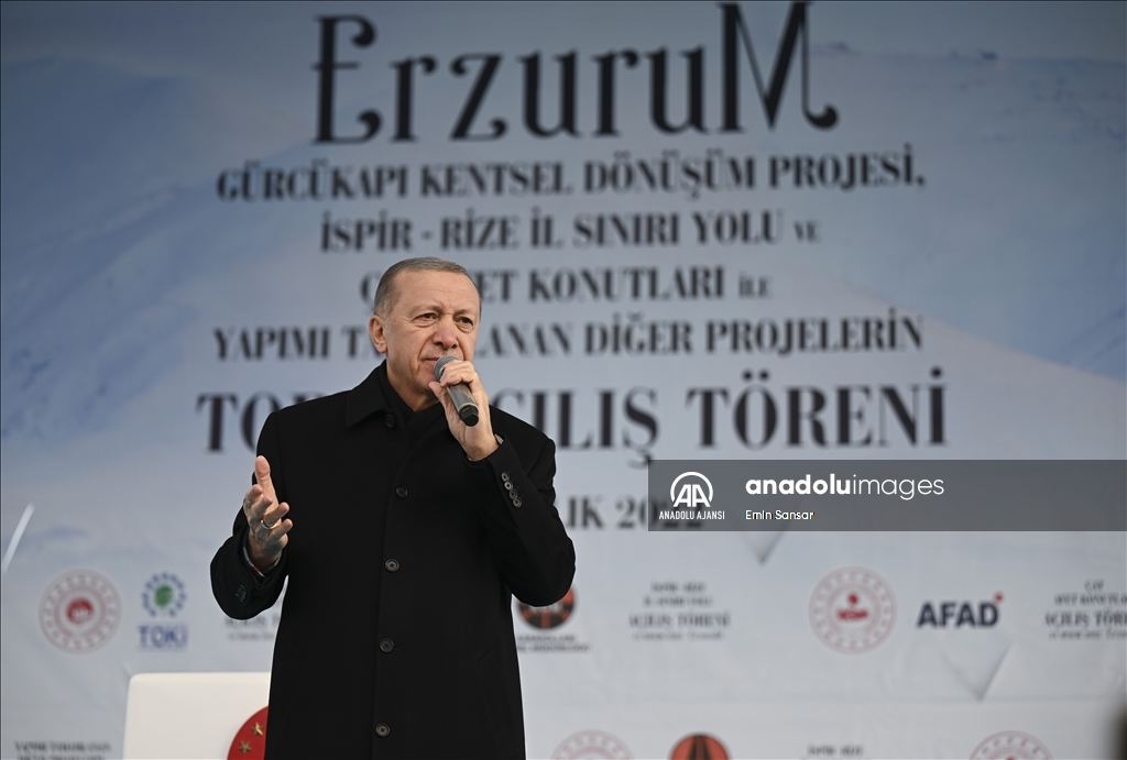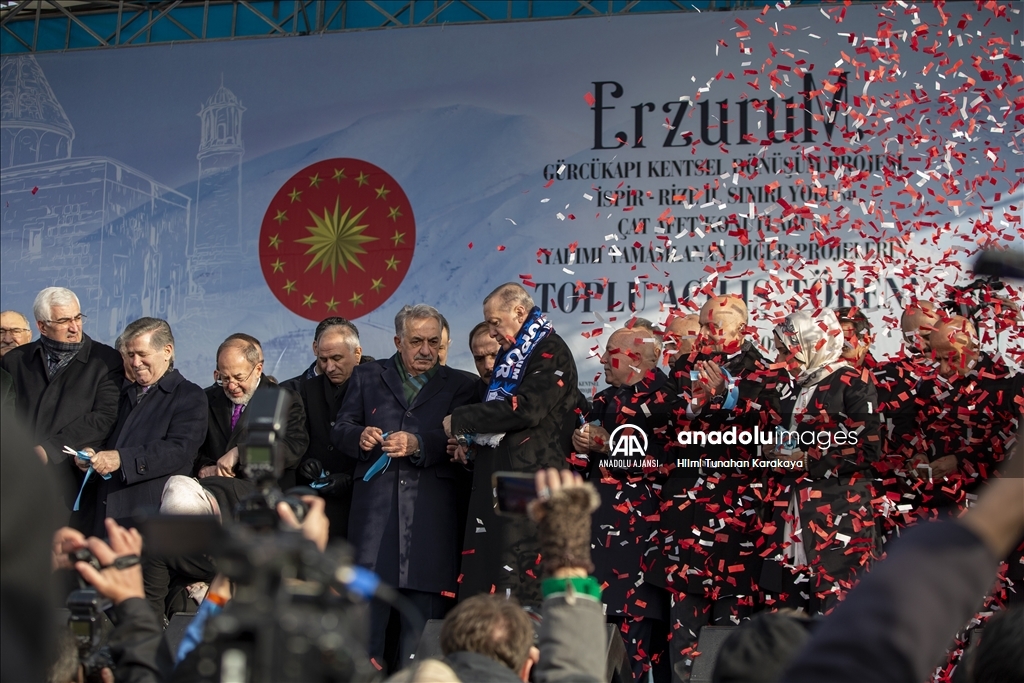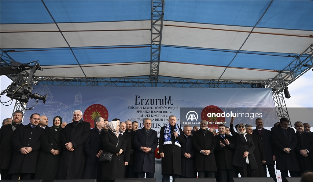 Cumhurbaşkanı Recep Tayyip Erdoğan, Erzurum yeni miting alanında, Gürcükapı Kentsel Dönüşüm Projesi, İspir-Rize İl Sınırı Yolu ve Çat Afet Konutları ile yapımı tamamlanan diğer projelerin toplu açılış törenine katılarak konuşma yaptı. ( Hilmi Tunahan Karakaya - Anadolu Ajansı )Hilmi Tunahan Karakaya