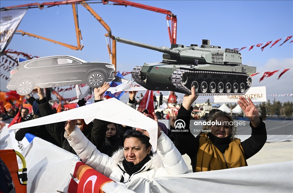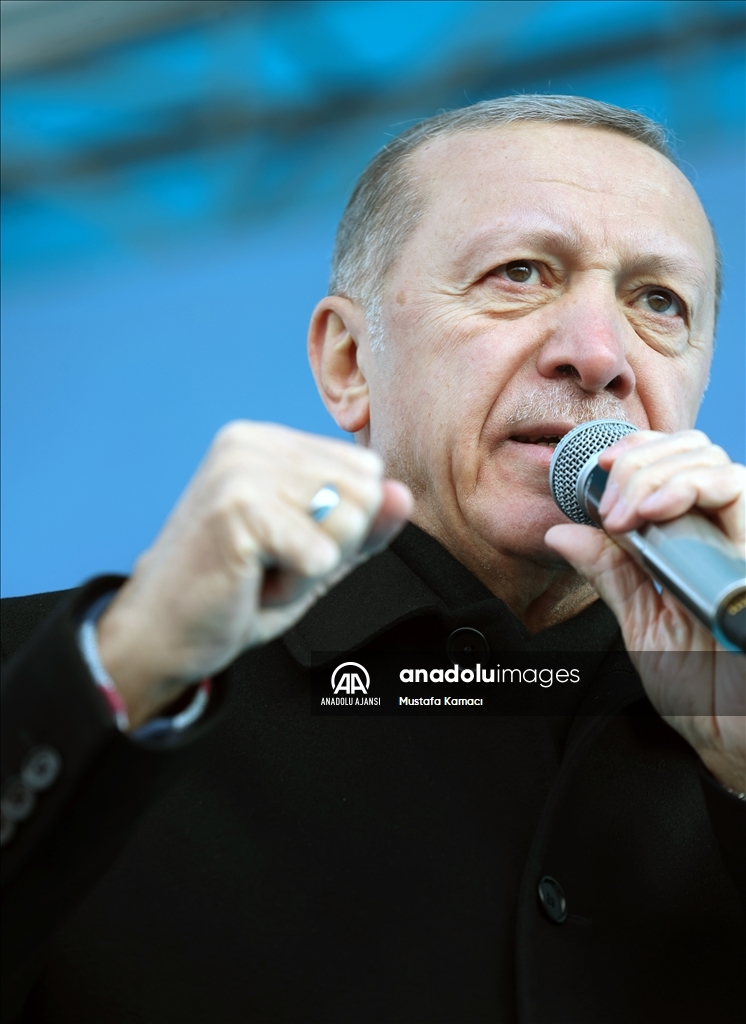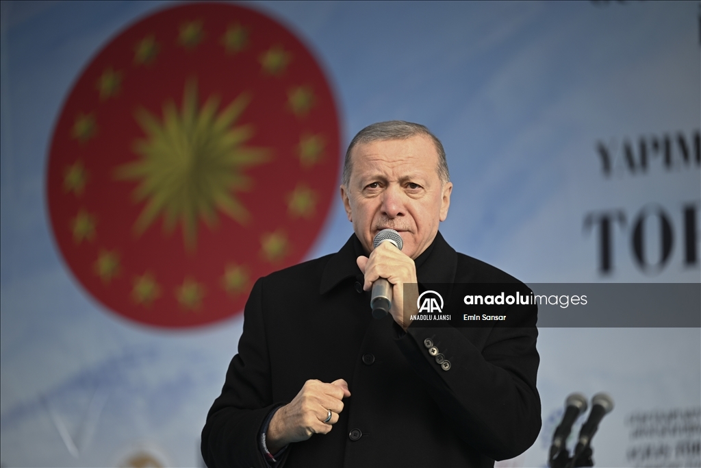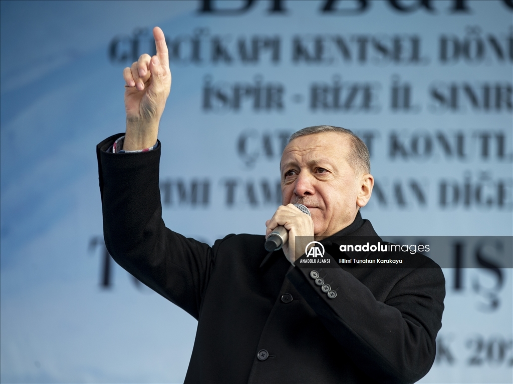 Cumhurbaşkanı Recep Tayyip Erdoğan, Erzurum yeni miting alanında, Gürcükapı Kentsel Dönüşüm Projesi, İspir-Rize İl Sınırı Yolu ve Çat Afet Konutları ile yapımı tamamlanan diğer projelerin toplu açılış törenine katılarak konuşma yaptı. ( Hilmi Tunahan Karakaya - Anadolu Ajansı )Hilmi Tunahan Karakaya