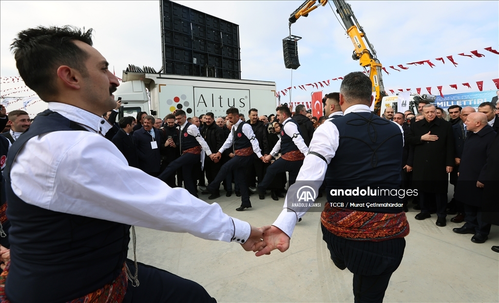 Cumhurbaşkanı Recep Tayyip Erdoğan, Erzurum yeni miting alanında, Gürcükapı Kentsel Dönüşüm Projesi, İspir-Rize İl Sınırı Yolu ve Çat Afet Konutları ile yapımı tamamlanan diğer projelerin toplu açılış törenine katıldı. Erdoğan'ın programa gelişinde halk oyunları ekibi gösteri sundu. ( TCCB / Murat Çetinmühürdar - Anadolu Ajansı )TCCB / Murat Çetinmühürdar