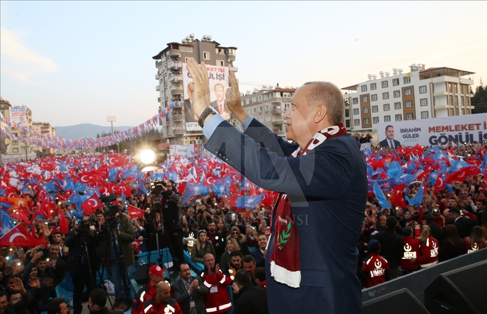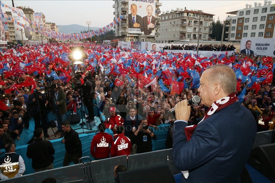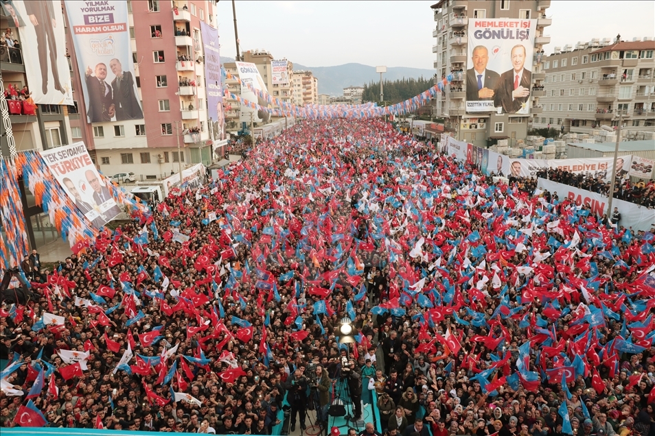 Türkiye Cumhurbaşkanı ve AK Parti Genel Başkanı Recep Tayyip Erdoğan, partisi tarafından Hatay İtfaiye Meydanı'nda düzenlenen mitinge katıldı. Erdoğan, konuşmasının ardından Hatay'daki belediye başkan adaylarıyla halkı selamladı. ( İbrahim Erikan - Anadolu Ajansı )İbrahim Erikan