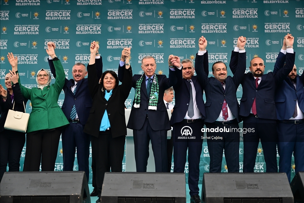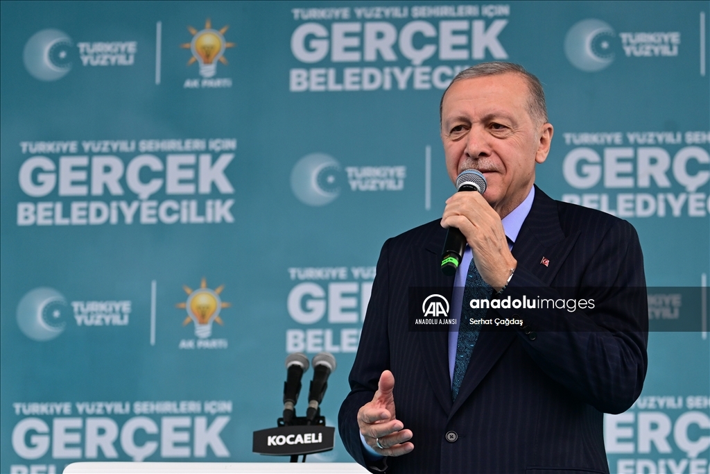 Cumhurbaşkanı ve AK Parti Genel Başkanı Recep Tayyip Erdoğan, partisinin Kocaeli Kongre Merkezi Miting Alanı'nda düzenlediği mitinge katıldı. Cumhurbaşkanı Erdoğan, il ve ilçe belediye başkan adayları ile birlikte vatandaşları selamladı. ( TCCB / Murat Çetinmühürdar - Anadolu Ajansı )TCCB / Murat Çetinmühürdar