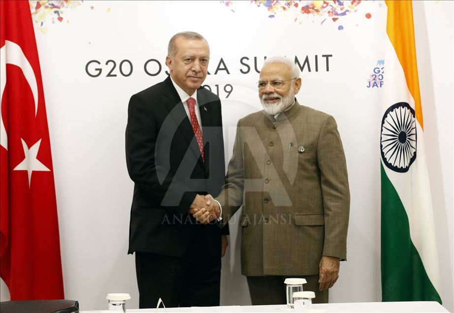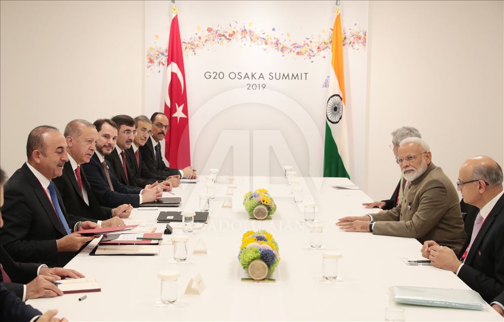 Türkiye Cumhurbaşkanı Recep Tayyip Erdoğan, G20 Liderler Zirvesi kapsamında INTEX Osaka Fuar Merkezi’nde Hindistan Başbakanı Narendra Modi ile görüştü. Görüşmede Dışişleri Bakanı Mevlüt Çavuşoğlu, Hazine ve Maliye Bakanı Berat Albayrak, Cumhurbaşkanlığı Sözcüsü İbrahim Kalın ile AK Parti Genel Başkan Yardımcısı Cevdet Yılmaz da hazır bulundu. ( Cumhurbaşkanlığı / Murat Çetinmühürdar - Anadolu Ajansı )Cumhurbaşkanlığı / Murat Çetinmühürdar