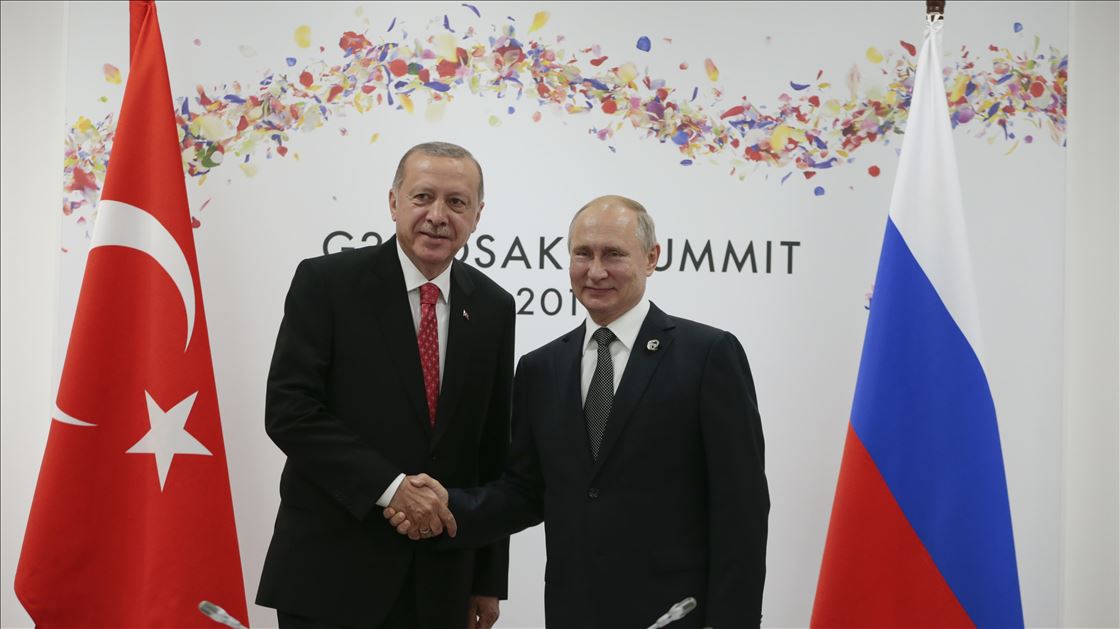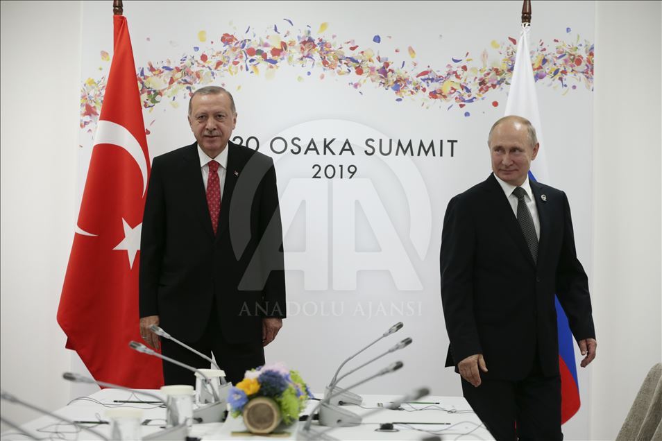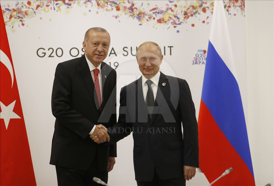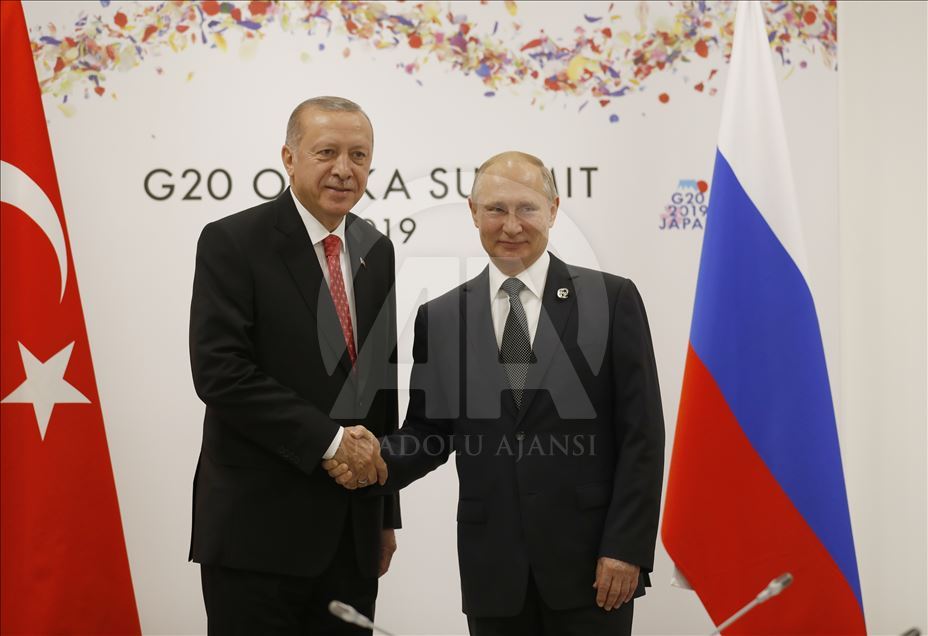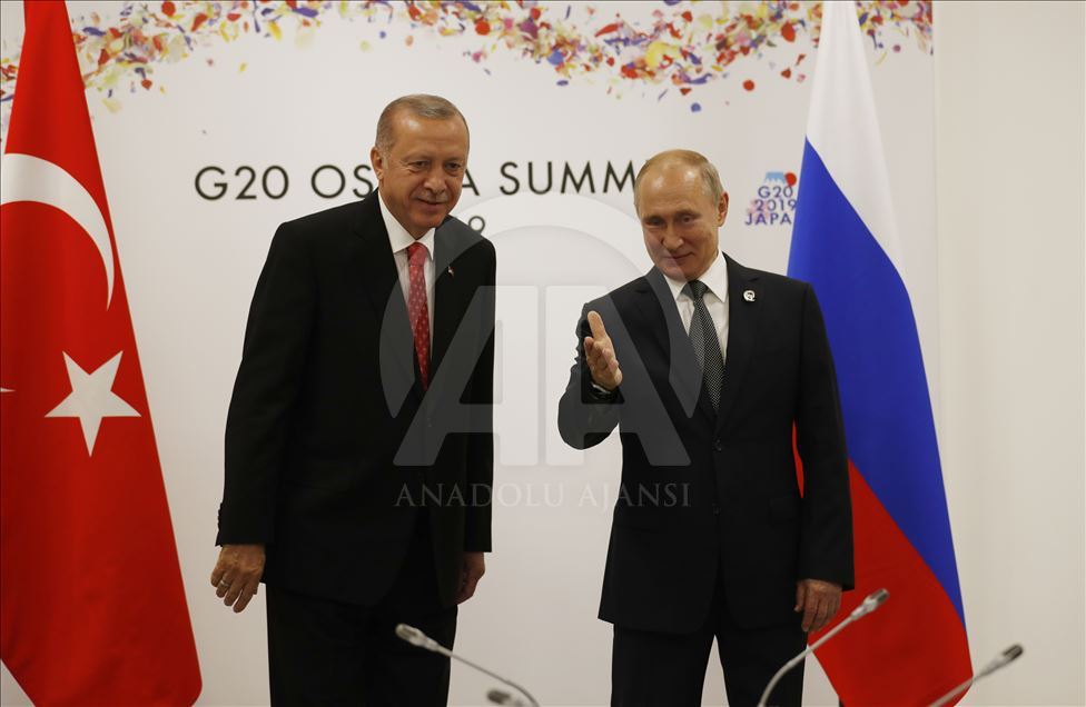 Türkiye Cumhurbaşkanı Recep Tayyip Erdoğan, G20 Liderler Zirvesi'nin yapıldığı INTEX Osaka Fuar Merkezi'ndeki temasları kapsamında Rusya Devlet Başkanı Vladimir Putin ile görüştü. ( Cumhurbaşkanlığı / Murat Çetinmühürdar - Anadolu Ajansı )Cumhurbaşkanlığı / Murat Çetinmühürdar
