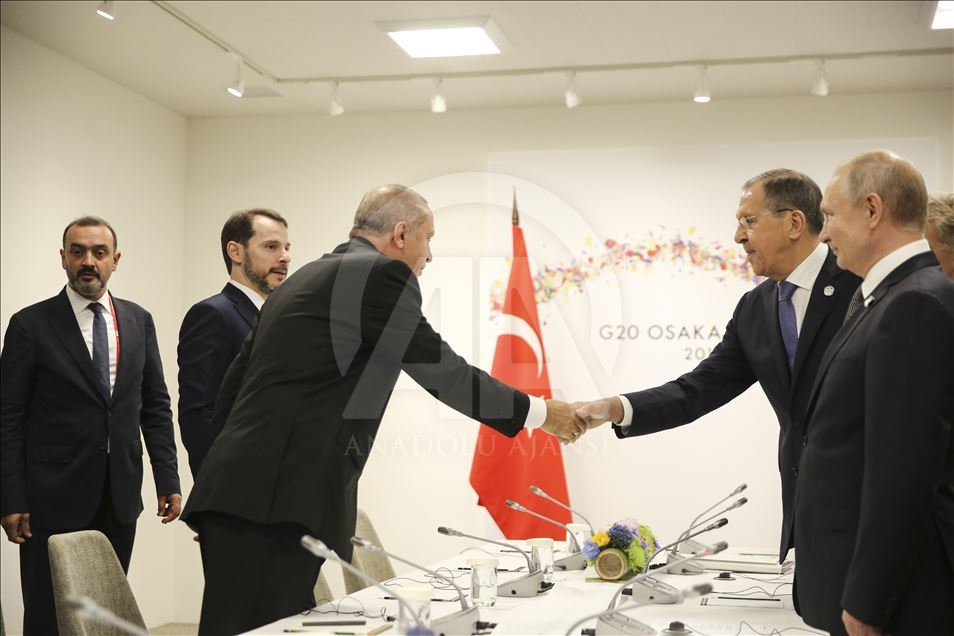 Japonya’nın ev sahipliğinde Osaka’da düzenlenen G20 Liderler Zirvesine katılan Türkiye Cumhurbaşkanı Recep Tayyip Erdoğan, Rusya Devlet Başkanı Vladimir Putin ile bir araya geldi. Cumhurbaşkanı Erdoğan, görüşmeye katılan Rusya Dışişleri Bakanı Sergey Lavrov ile tokalaştı. ( Metin Aktas - Anadolu Ajansı )Metin Aktas