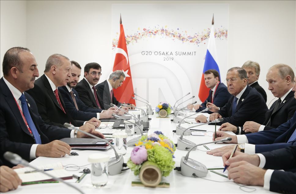 Japonya’nın ev sahipliğinde Osaka’da düzenlenen G20 Liderler Zirvesine katılan Türkiye Cumhurbaşkanı Recep Tayyip Erdoğan, Rusya Devlet Başkanı Vladimir Putin ile bir araya geldi. Görüşmede, Dışişleri Bakanı Mevlüt Çavuşoğlu (solda), Hazine ve Maliye Bakanı Berat Albayrak (sol 3) ve AK Parti Genel Başkan Yardımcısı Cevdet Yılmaz (sol 4) da yer aldı. ( Metin Aktas - Anadolu Ajansı )Metin Aktas