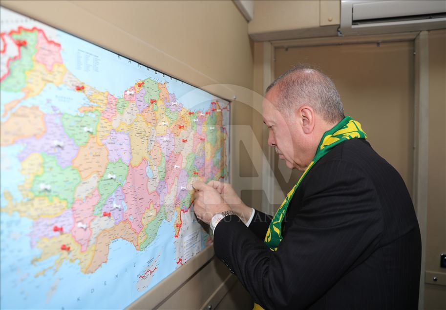 Türkiye Cumhurbaşkanı ve AK Parti Genel Başkanı Recep Tayyip Erdoğan, partisinin Şanlıurfa'da düzenlediği mitinge katıldı. Cumhurbaşkanı Erdoğan, mitinglerde kullandığı tırın içerisinde yer alan haritada, vatandaşlara hitap ettiği Şanlıurfa'nın üzerini raptiye ile işaretledi. ( Cumhurbaşkanlığı / Kayhan Özer - Anadolu Ajansı )Cumhurbaşkanlığı / Kayhan Özer