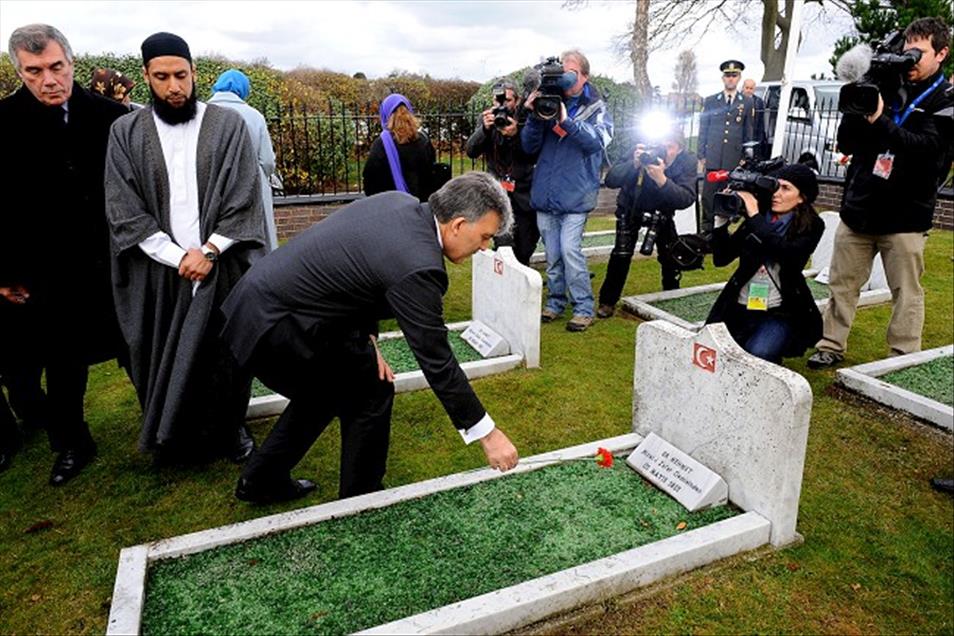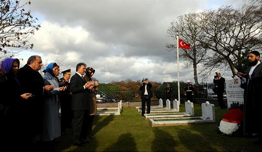 CUMHURBASKANI ABDULLAH GUL VE ESI HAYRUNNISA GUL, PORTSMOUTH DA BULUNAN TURK DENIZ SEHITLIGINI ZIYARET ETTI. CUMHURBASKANI GUL VE ESI HAYRUNNISA GUL, MEZARLARA KARANFIL BIRAKTI. (ANADOLU AJANSI - MEHMET KAMAN)(20111124)MEHMET KAMAN