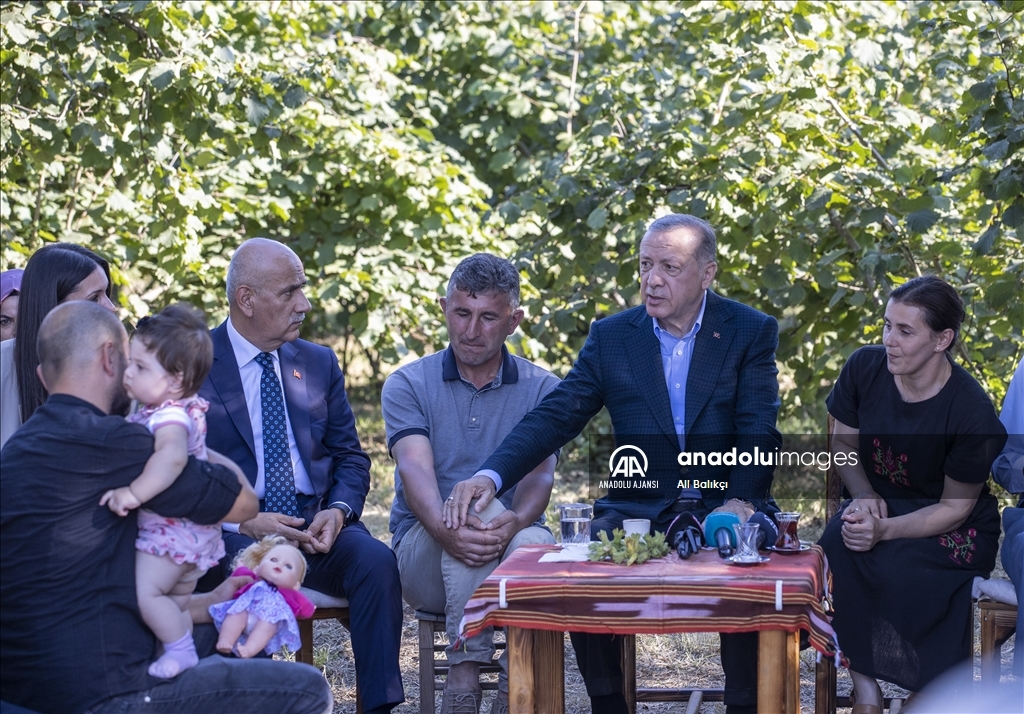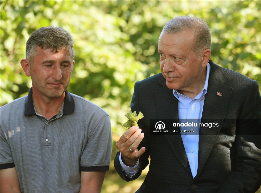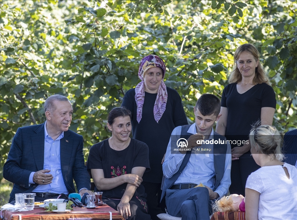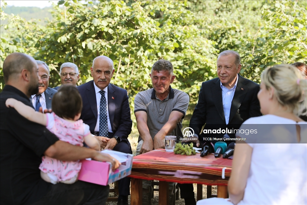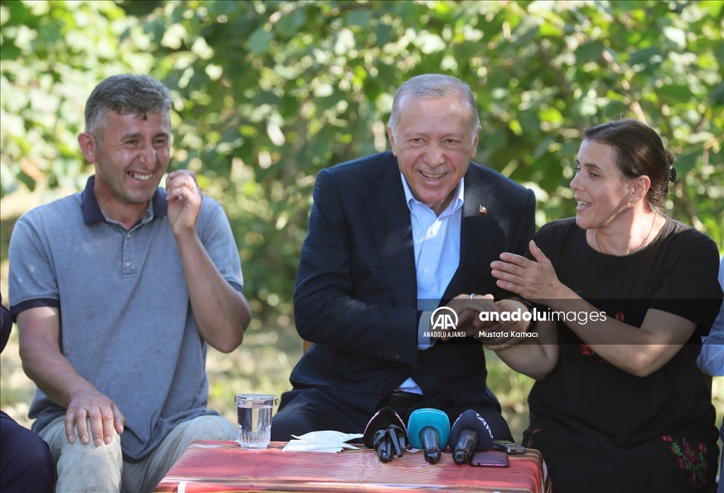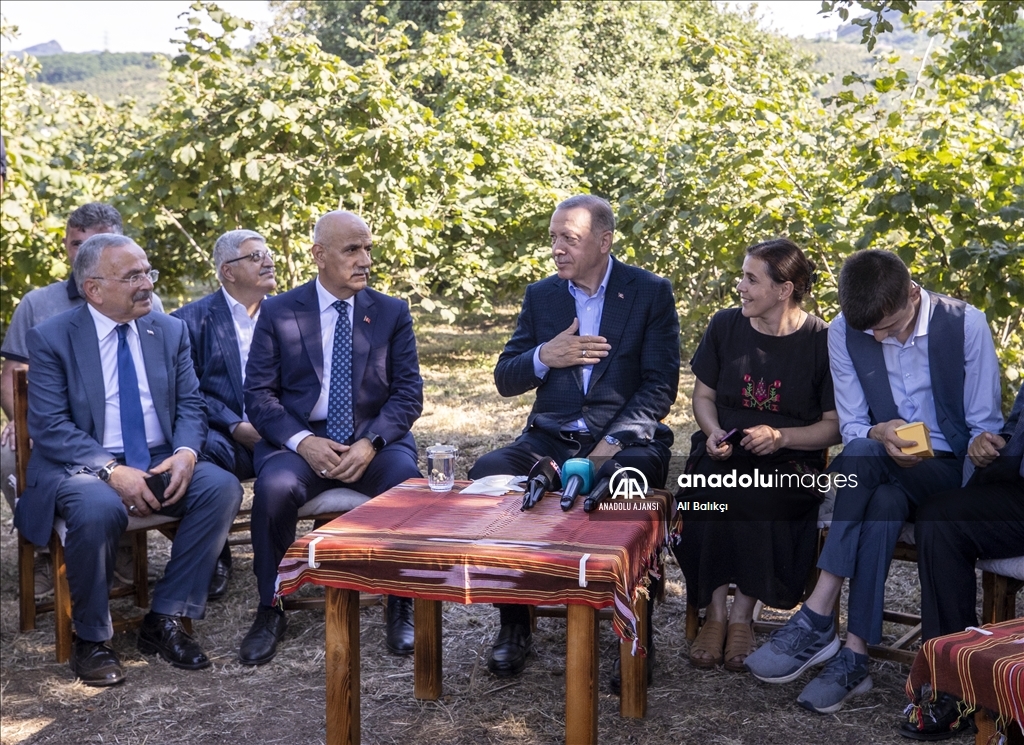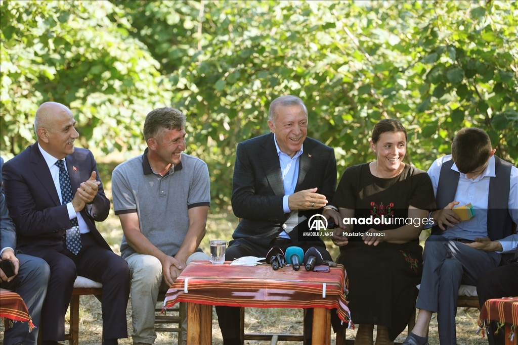 Cumhurbaşkanı Recep Tayyip Erdoğan, Ordu'daki temasları kapsamında fındık üreticisi bir aileyi ziyaret etti. Cumhurbaşkanı Erdoğan, fındık bahçesinde aileyle bir süre sohbet etti.