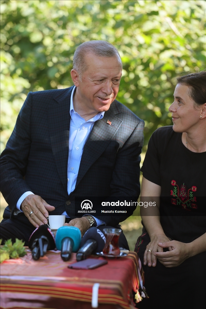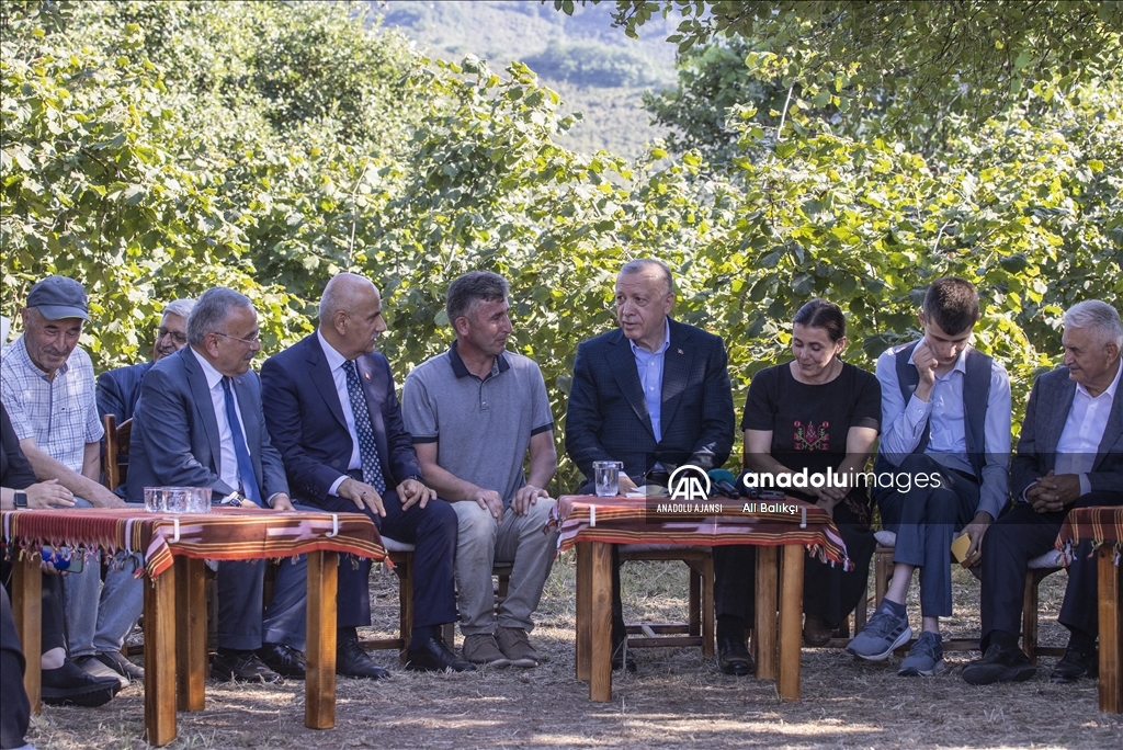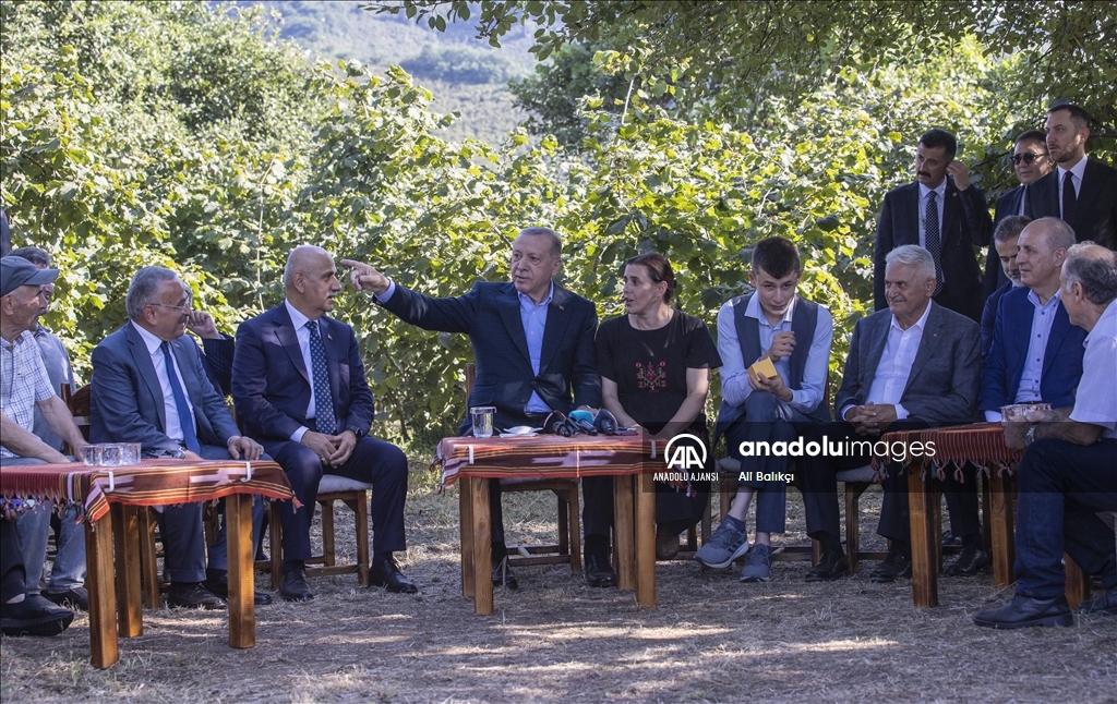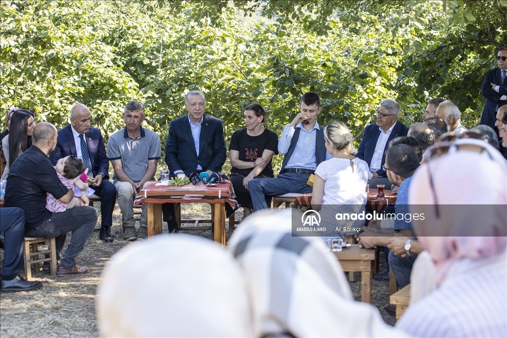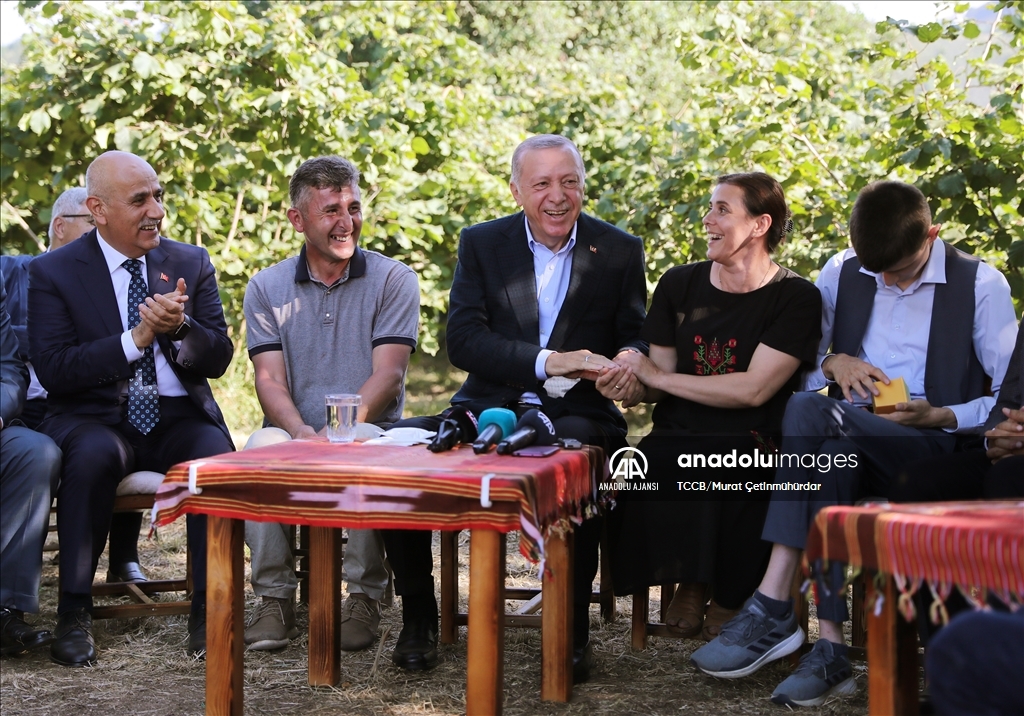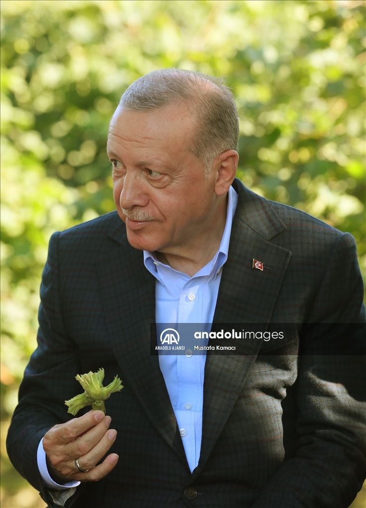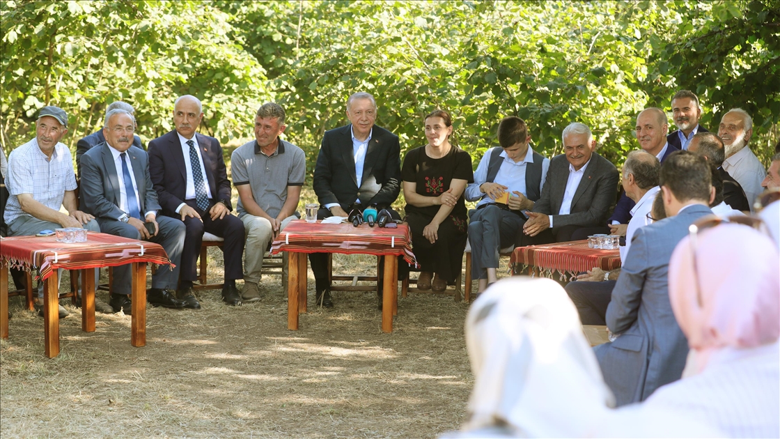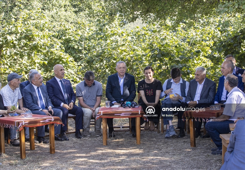 Cumhurbaşkanı Recep Tayyip Erdoğan, Ordu'daki temasları kapsamında fındık üreticisi bir aileyi ziyaret etti. Cumhurbaşkanı Erdoğan, fındık bahçesinde aileyle bir süre sohbet etti.