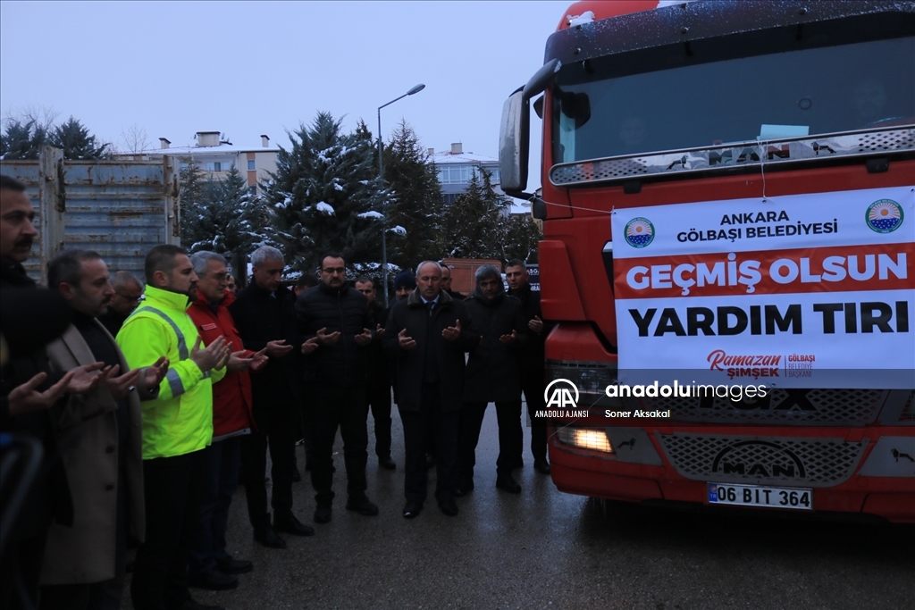 Ankara'nın Gölbaşı ilçesinde Kahramanmaraş'taki depremlerden etkilenenler için başlatılan kampanya doğrultusunda toplanan ihtiyaç malzemeleri, dualarla yola çıkarıldı. ( Soner Aksakal - Anadolu Ajansı )Soner Aksakal