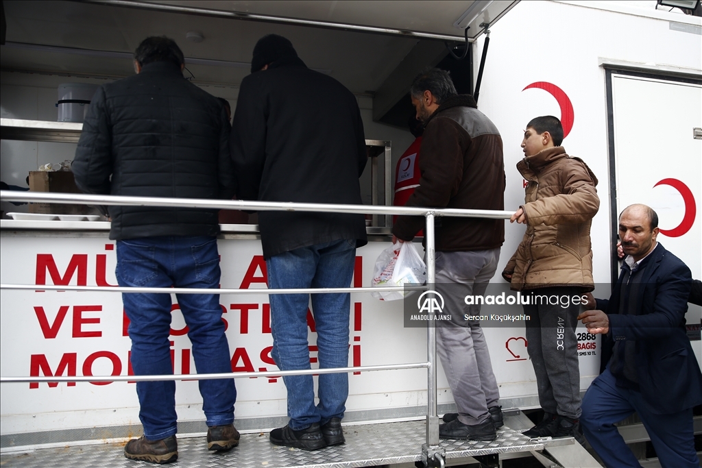 Malatya'da, Kahramanmaraş merkezli, 10 ili etkileyen 7,7 ve 7,6 büyüklüğündeki depremlerin ardından yıkılan binalarda arama kurtarma çalışmaları devam ediyor. Malatya Kızılay tarafından kurulan çadırlarda vatandaşlara sıcak yemek dağıtılıyor. ( Sercan Küçükşahin - Anadolu Ajansı )Sercan Küçükşahin