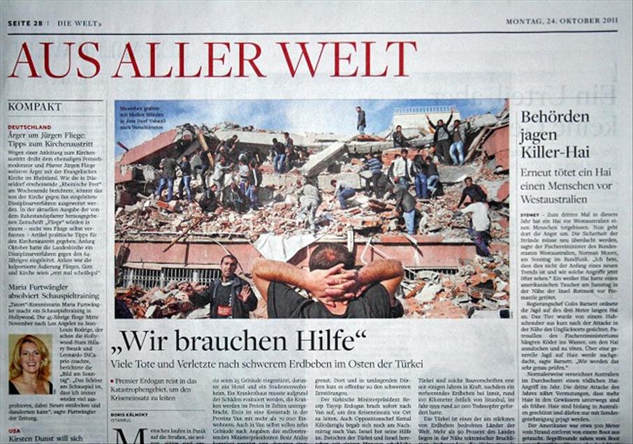 ALMAN BASININDA ANADOLU AJANSI'NIN DEPREM FOTOGRAFLARI GENIS YER BULDU. "DIE WELT" GAZETESI HABER ICIN "YARDIMA IHTIYACIMIZ VAR" BASLIGINI KULLANDI. (ANADOLU AJANSI)(20111024)
