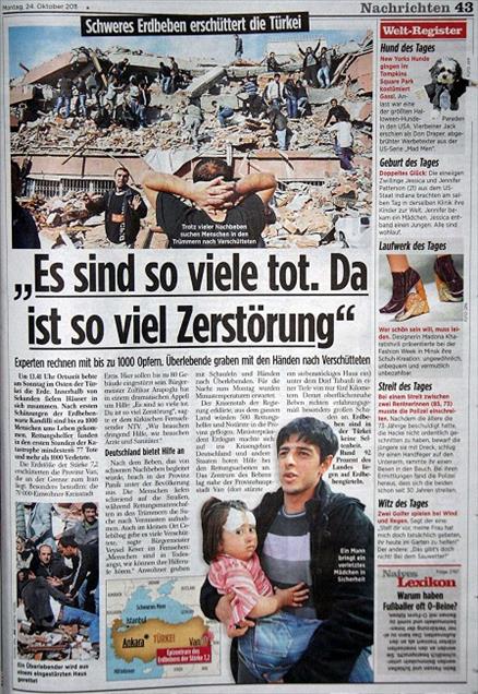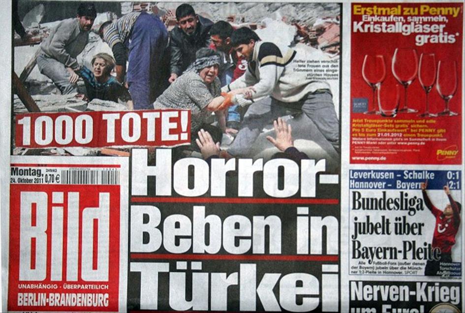 ALMAN BASININDA ANADOLU AJANSI'NIN DEPREM FOTOGRAFLARI GENIS YER BULDU. "B.Z" GAZETESI HABER ICIN "SIDDETLI DEPREM TURKIYE'YI SARSTI" BASLIGINI KULLANDI. (ANADOLU AJANSI)(20111024)