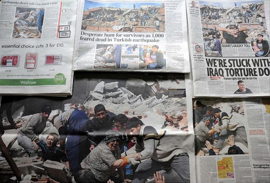 INGILIZ GAZETELERI VAN'DAKI DEPREME ILISKIN HABER VE FOTOGRAFLARA BUGUNKU SAYILARINDA GENIS YER VERDI. GAZETELERIN BAZILARININ ANA SAYFADA, BAZILARININ DA IC SAYFADAN DUYURDUGU HABERLERDE, BOLGEDEKI ANADOLU AJANSI MUHABIR VE FOTOMUHABIRLERININ CEKTIGI FOTOGRAFLAR KULLANILDI. GUARDIAN GAZETESI AYRICA ORTA SAYFASINDAN, GOCUKTEN KURTARILAN IKI KADININ YER ALDIGI ANADOLU AJANSI MUHABIRI ALI IHSAN OZTURK'UN FOTOGRAFINI IKI TAM SAYFA BASARAK YAYIMLADI. (ANADOLU AJANSI) (20111024)