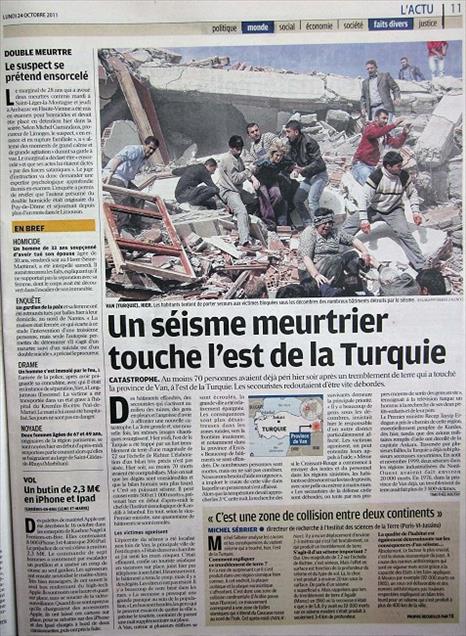 FRANSA'NIN ONEMLI GAZETELERINDE VAN'DA MEYDANA GELEN 7.2 SIDDETINDEKI DEPREME BUYUK YER VERILDI. FRANSA'NIN EN BUYUK GAZETELERINDEN "LE PARISIEN" 11. SAYFASINININ TAMAMNI DEPREME AYIRDI. (ANADOLU AJANSI-MUSTAFA YALCIN)(20111024)MUSTAFA YALCIN