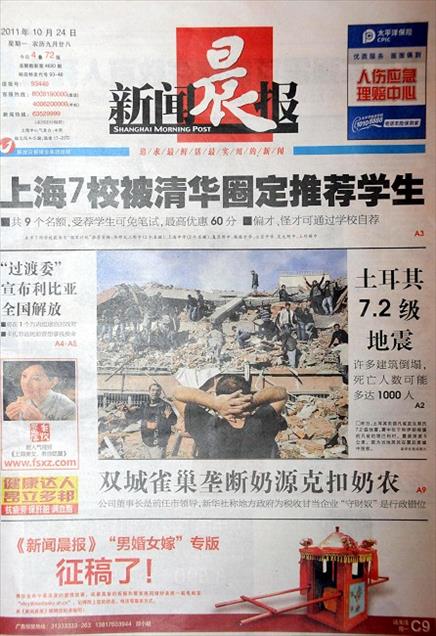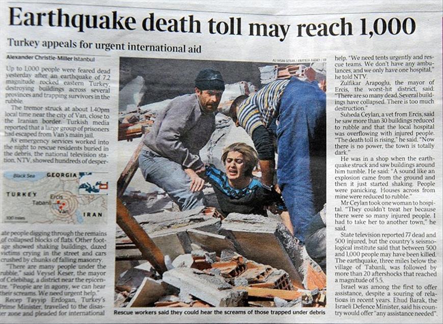 CIN BASINI VAN DEPREMINI MANSETTEN AA'NIN HABERLERI VE FOTOGRAFLARI ILE DUYURDU.