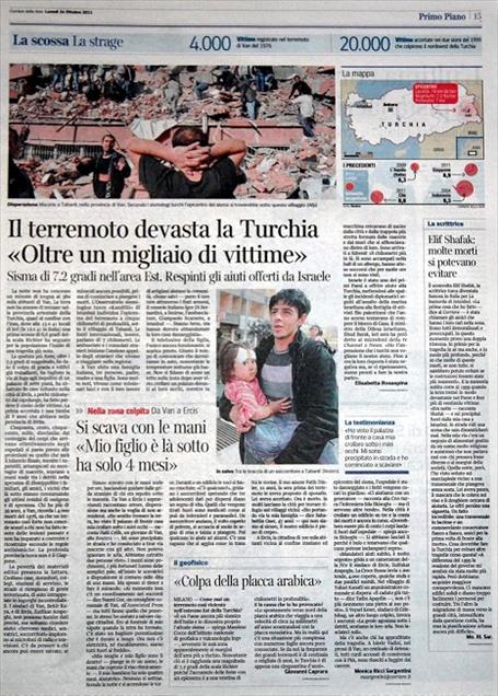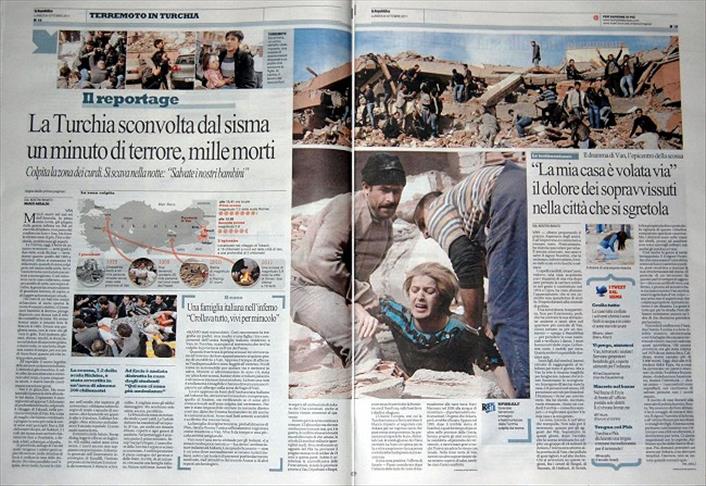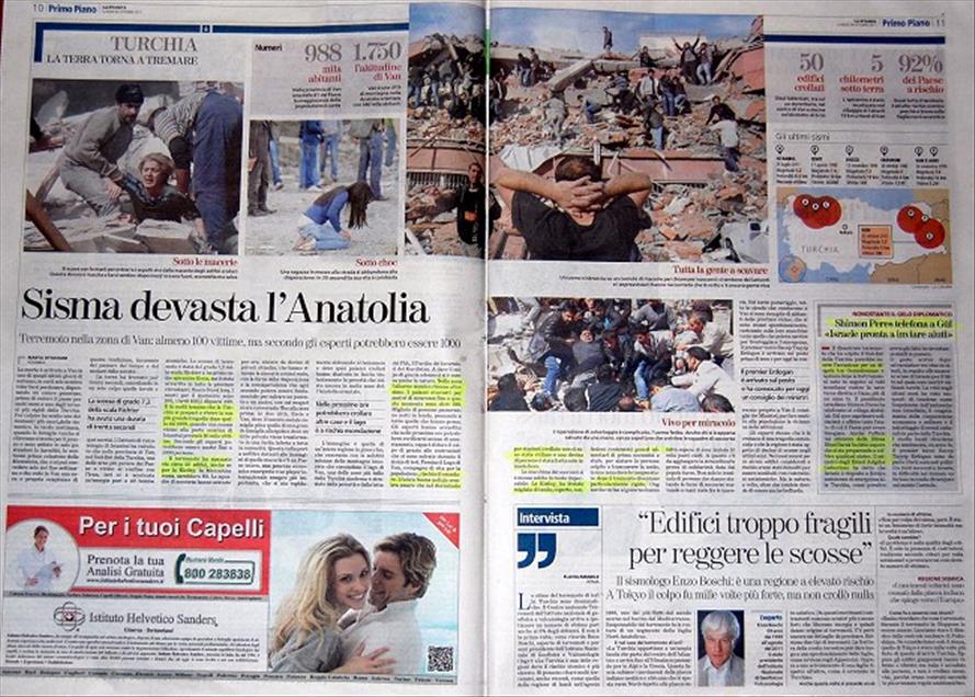 VAN'DA MEYDANA GELEN 7.2 SIDDETINDEKI DEPREM VE NEDEN OLDUGU FELAKET, ITALYAN BASININDA GENIS YER BULDU. ITALYA'NIN ONDE GELEN GAZETELERI DEPREMI AA'NIN BOLGEDEN CEKTIGI FOTOGRAFLARLA SUNDU. CORRIERE DELLA SERA GAZETESI DEPREMI OKUYUCULARINA "DEPREM, TURKIYE'YI YIKTI" BASLIGIYLA DUYURDU. (ANADOLU AJANSI) (20111024)