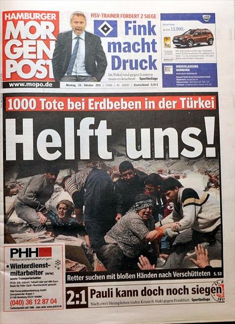 ALMAN BASININDA ANADOLU AJANSI'NIN DEPREM FOTOGRAFLARI GENIS YER BULDU. HAMBURGER MORGENPOST GAZETESI DE DEPREM HABERINI MANSETINE TASIDI. (ANADOLU AJANSI) (20111024)