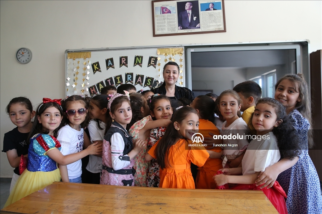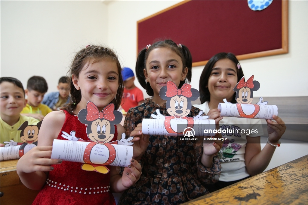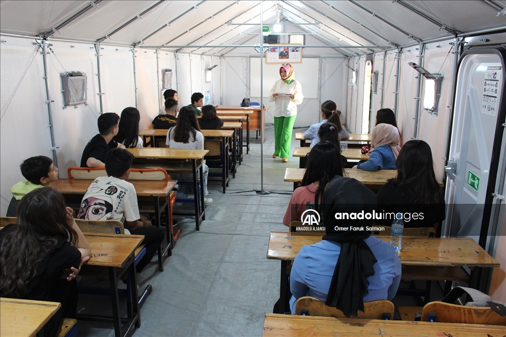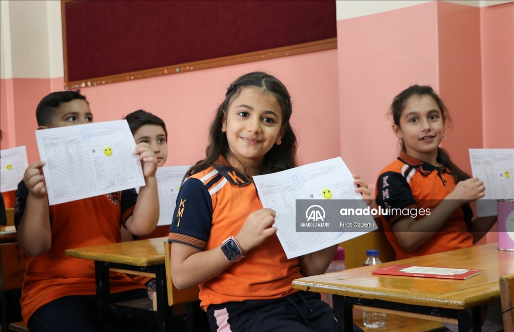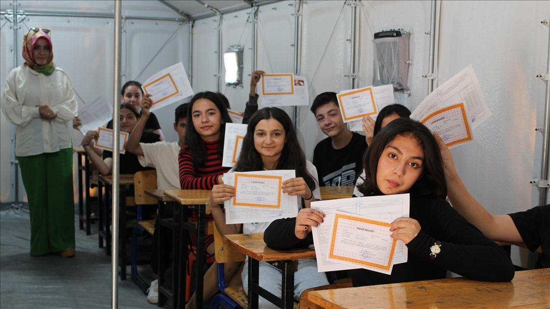 "Asrın felaketi" olarak nitelendirilen 6 Şubat depremlerinin merkez üssü Kahramanmaraş'ta da öğrenciler karnelerini almanın sevincini yaşadı. Muhsin Yazıcıoğlu Mesire Alanı'nda oluşturulan Muhsin Yazıcıoğlu Eğitim Vadisi'nde de eğitimlerini tamamlayan 310'u 4, 215'i 8. sınıf olmak üzere 525 öğrenci ile Karacasu Konteyner Kentte oluşturulan prefabrik okuldaki 510 öğrenci karnelerini aldı. ( Ömer Faruk Salman - Anadolu Ajansı )Ömer Faruk Salman