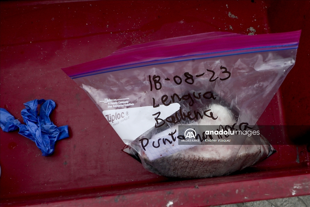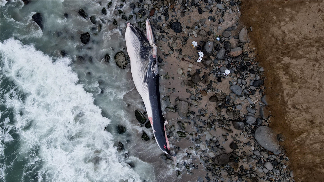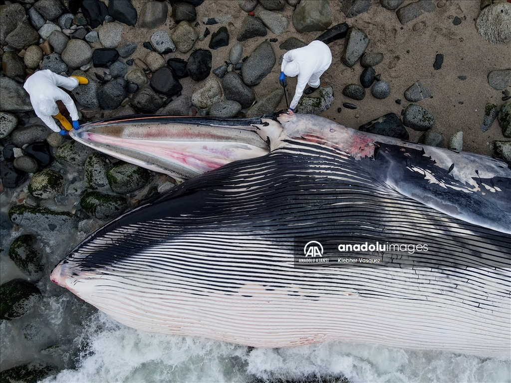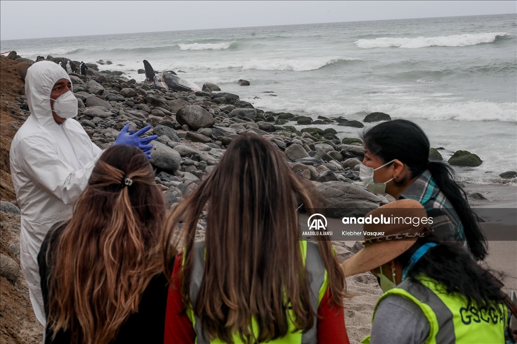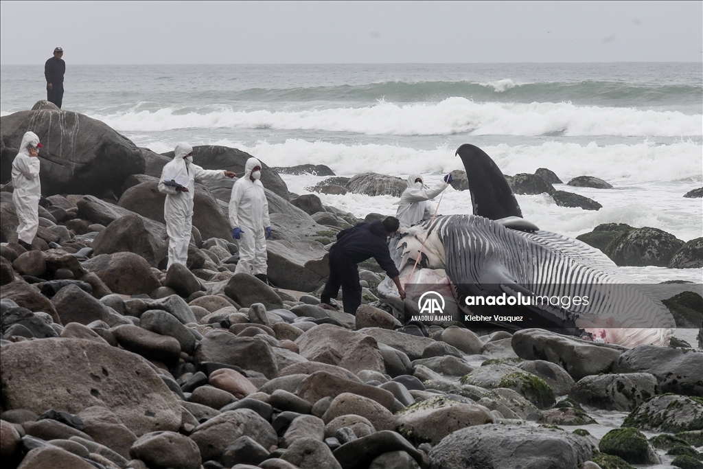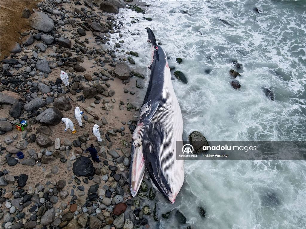 Peru’nun başkenti Lima’da dev balina cesedi Punta Hermosa plajı kıyısına vurdu. Peru Deniz Enstitüsü (IMARPE) araştırma ekibi, karaya vuran balinanın türünü ve ölüm nedenini belirlemek için çalışmalarını sürdürüyor. ( Klebher Vasquez - Anadolu Ajansı )Klebher Vasquez