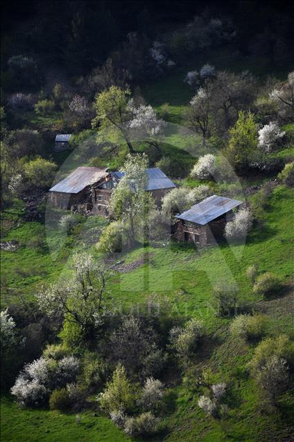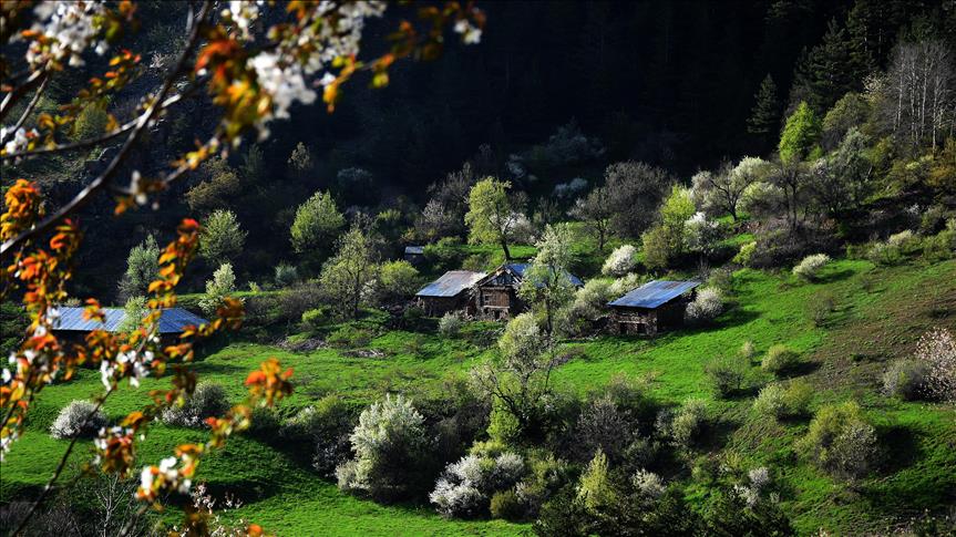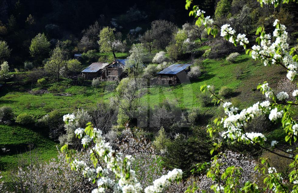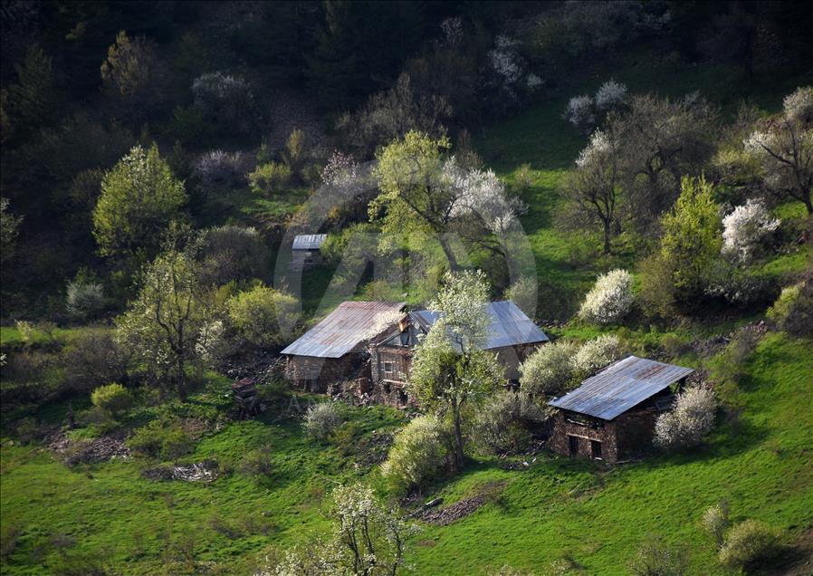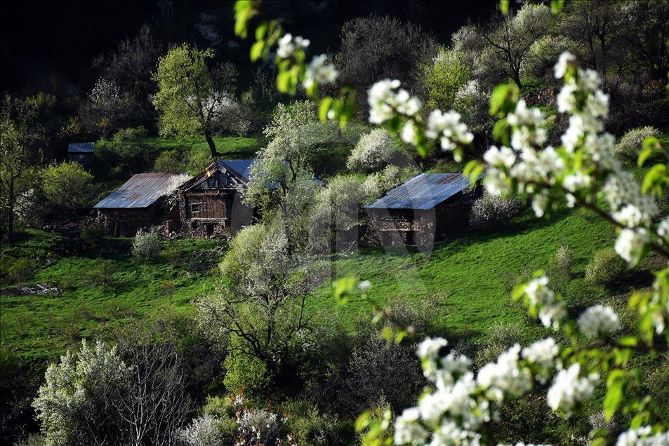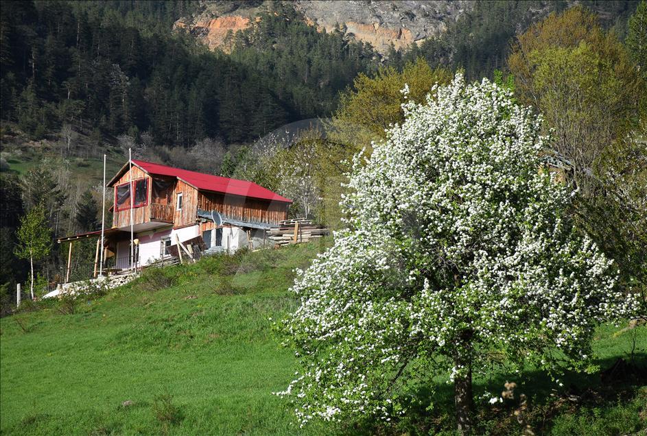 Gümüşhane'nin Torul ilçe sınırları içerisinde bulunan Tarihi İpek Yolu üzerindeki 2 bin 50 rakımlı Zigana Dağı'nın eteklerinde çiçek açan meyve ağaçlarının renk cümbüşüne, tabiatın yeşilliği ve tarihi yayla evleri eşlik ediyor.