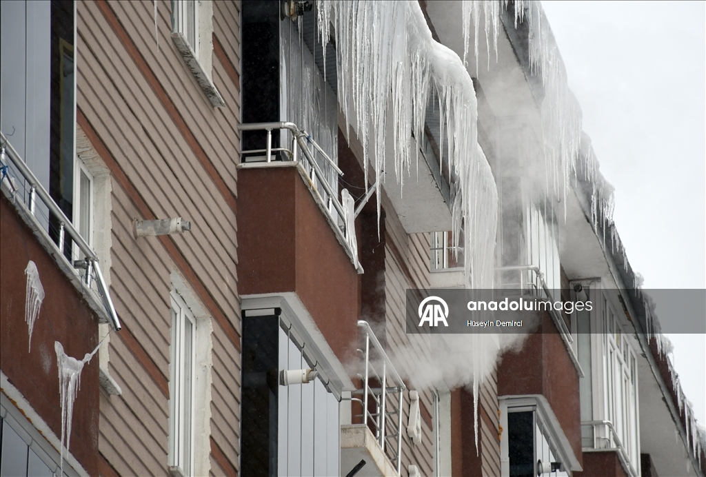 Kars'ın Sarıkamış ilçesi, dün başlayan ve aralıklarla devam eden kar nedeniyle beyaza büründü. Soğuk havanın etkisiyle bina çatılarında buz sarkıtları oluştu. ( Hüseyin Demirci - Anadolu Ajansı )Hüseyin Demirci