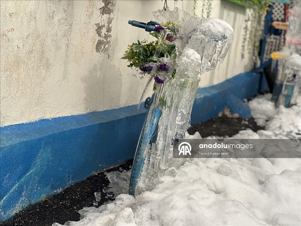 Erzurum'da gece başlayan kar yağışı kenti beyaza bürüdü. Soğuk havanın etkili olduğu kentte bir bisikletin üzerinde buz sarkıtları oluştu. ( Tevhid Furkan Nehri - Anadolu Ajansı )Tevhid Furkan Nehri
