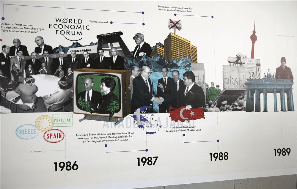 İsviçre'nin Davos kasabasında 21-24 Ocak'ta gerçekleştirilecek 50. Dünya Ekonomik Forumu'na 117 ülkeden 3 bin iş insanı, siyasetçi, akademisyen ve sivil toplum kuruluşu temsilcisi katılacak. Toplantıların yapıldığı kongre merkezinin duvarında Davos'a damga vuran önemli görüşmelerin yapıldığı fotoğraflar sergilendi. ( Dursun Aydemir - Anadolu Ajansı )Dursun Aydemir