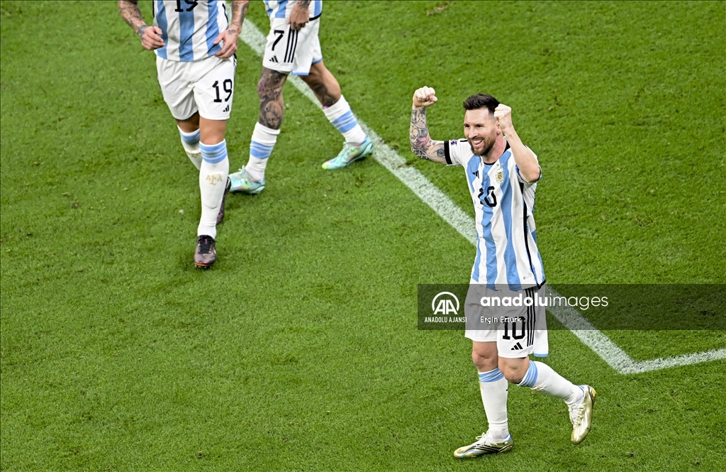 Katar'ın ev sahipliğinde düzenlenen 2022 FIFA Dünya Kupası final maçında Arjantin ile Fransa, Lusail Stadyumu'nda karşılaştı. Arjantin takımı oyuncusu Lionel Messi (10) attığı gol sonrası sevincini takım arkadaşlarıyla paylaştı. ( Erçin Ertürk - Anadolu Ajansı )Erçin Ertürk