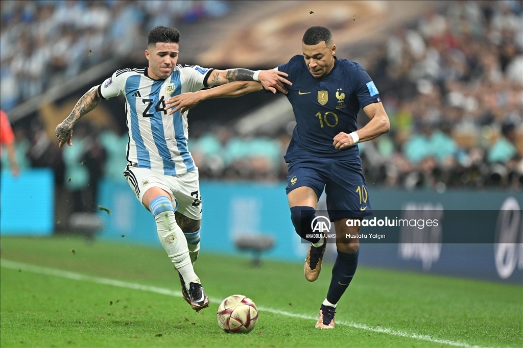 Katar'ın ev sahipliğinde düzenlenen 2022 FIFA Dünya Kupası final maçında Arjantin ile Fransa, Lusail Stadyumu'nda karşılaştı. Bir pozisyonda Arjantin takımı oyuncusu Enzo Fernandez (24) rakibi Kylian Mbappe (10) ile mücadele etti. ( Mustafa Yalçın - Anadolu Ajansı )Mustafa Yalçın
