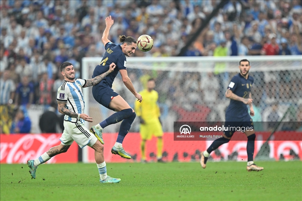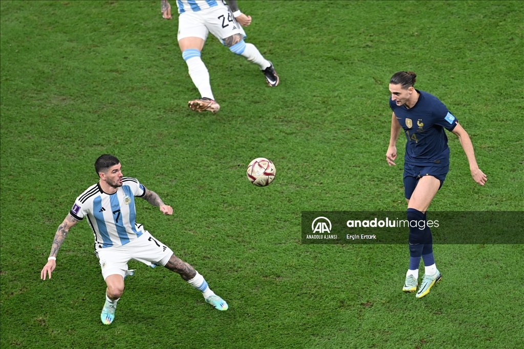 Katar'ın ev sahipliğinde düzenlenen 2022 FIFA Dünya Kupası final maçında Arjantin ile Fransa, Lusail Stadyumu'nda karşılaştı. Bir pozisyonda Arjantin takımı oyuncusu Rodrigo de Paul (7) rakibi Fransa takımı oyuncusu Adrien Rabiot (14) ile mücadele etti. ( Erçin Ertürk - Anadolu Ajansı )Erçin Ertürk