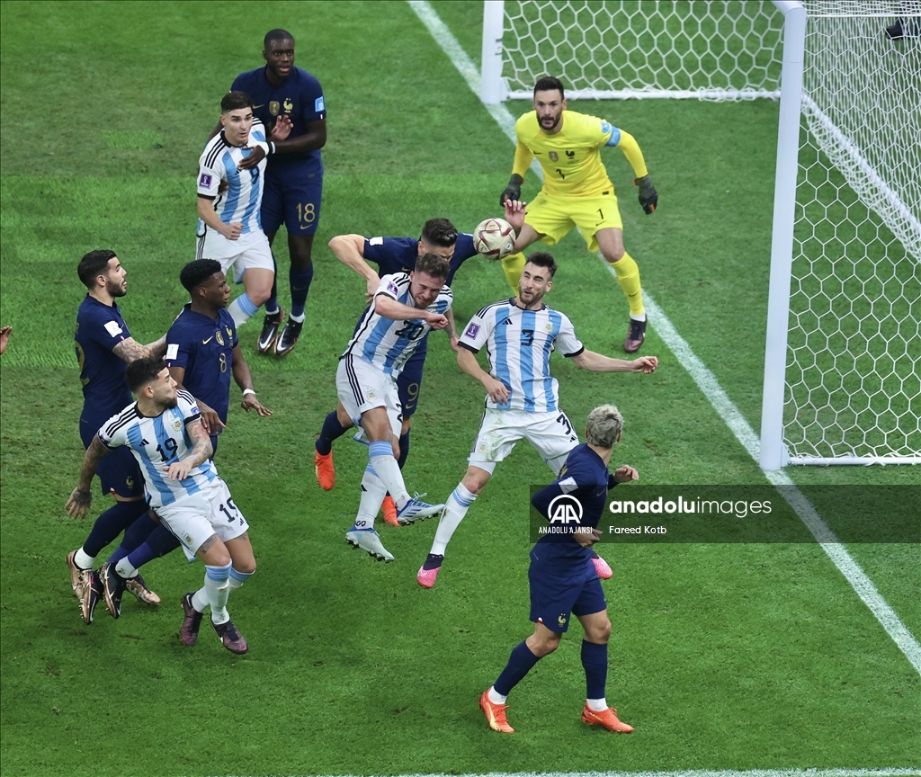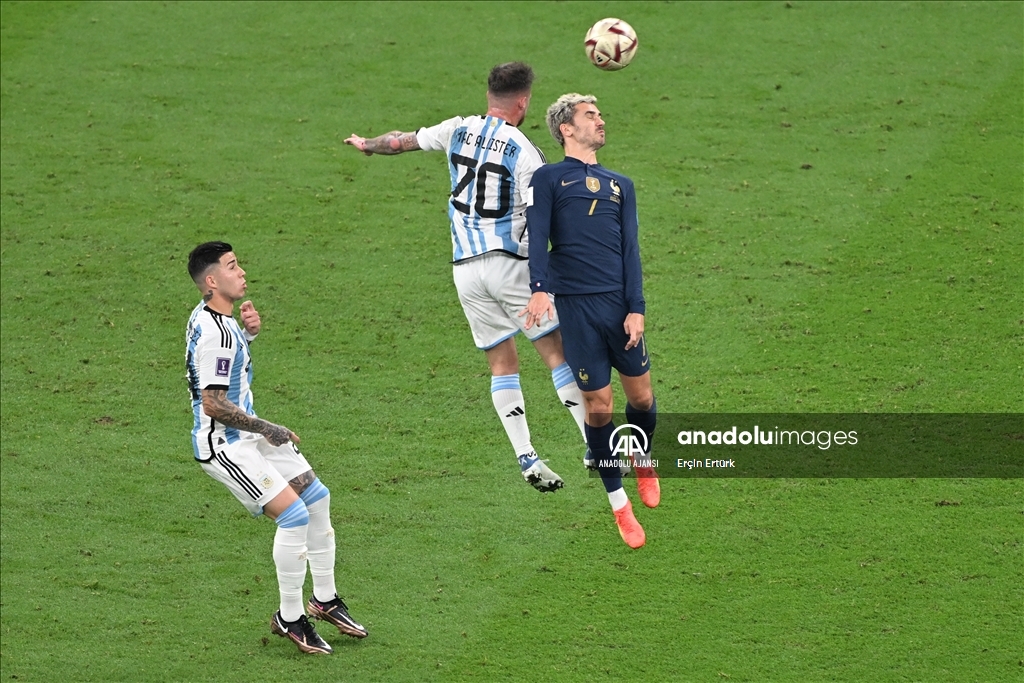 Katar'ın ev sahipliğinde düzenlenen 2022 FIFA Dünya Kupası final maçında Arjantin ile Fransa, Lusail Stadyumu'nda karşılaştı. Arjantin takımı oyuncusu Alexis Mac Allister (20) bir pozisyonda rakibi Antoine Griezmann (7) ile mücadele etti. ( Erçin Ertürk - Anadolu Ajansı )Erçin Ertürk