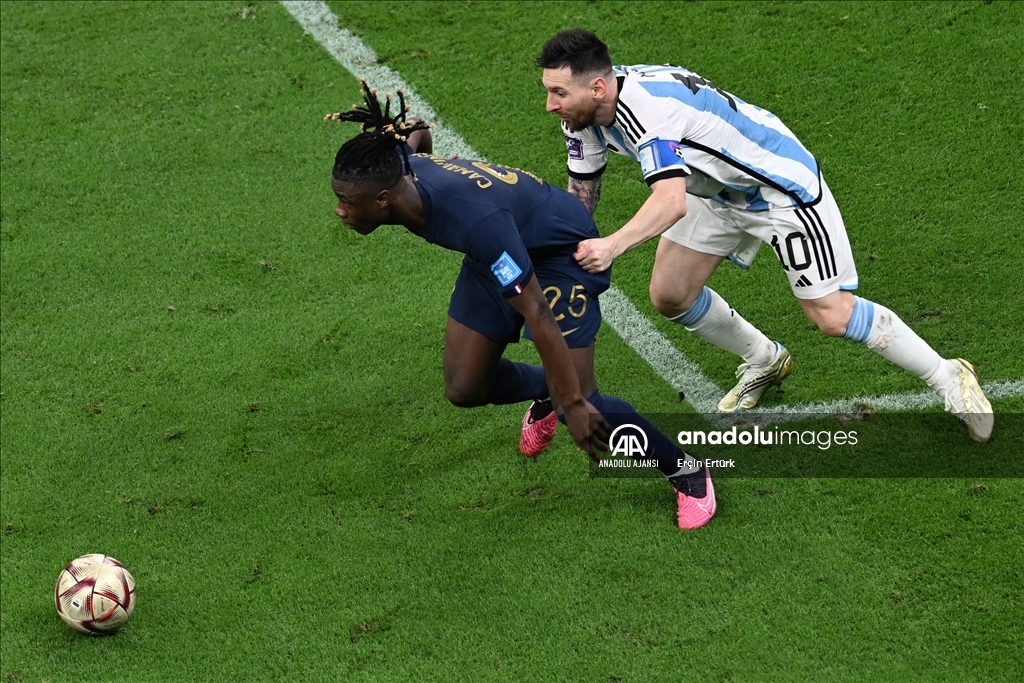 Katar'ın ev sahipliğinde düzenlenen 2022 FIFA Dünya Kupası final maçında Arjantin ile Fransa, Lusail Stadyumu'nda karşılaştı. Arjantinli futbolcu Lionel Messi (10), Fransız futbolcu Eduardo Camavinga (25) ile mücadele etti. ( Erçin Ertürk - Anadolu Ajansı )Erçin Ertürk