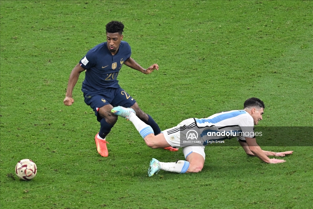 Katar'ın ev sahipliğinde düzenlenen 2022 FIFA Dünya Kupası final maçında Arjantin ile Fransa, Lusail Stadyumu'nda karşılaştı. Fransa takımı oyuncusu Kingsley Coman (20), bir pozisyonda Arjantin takımı oyuncusu ile mücadele etti.
