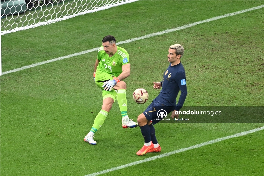 Katar'ın ev sahipliğinde düzenlenen 2022 FIFA Dünya Kupası final maçında Arjantin ile Fransa, Lusail Stadyumu'nda karşılaştı. Bir pozisyonda Arjantin takımı kalecisi Emiliano Martinez (23) rakibi Antoine Griezmann (7) ile mücadele etti. ( Erçin Ertürk - Anadolu Ajansı )Erçin Ertürk