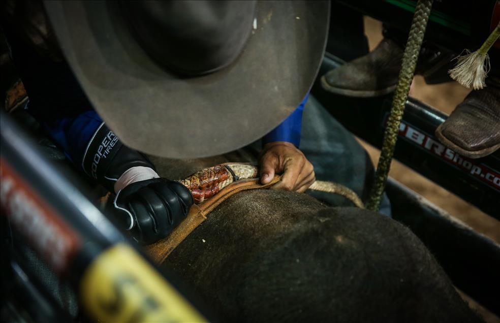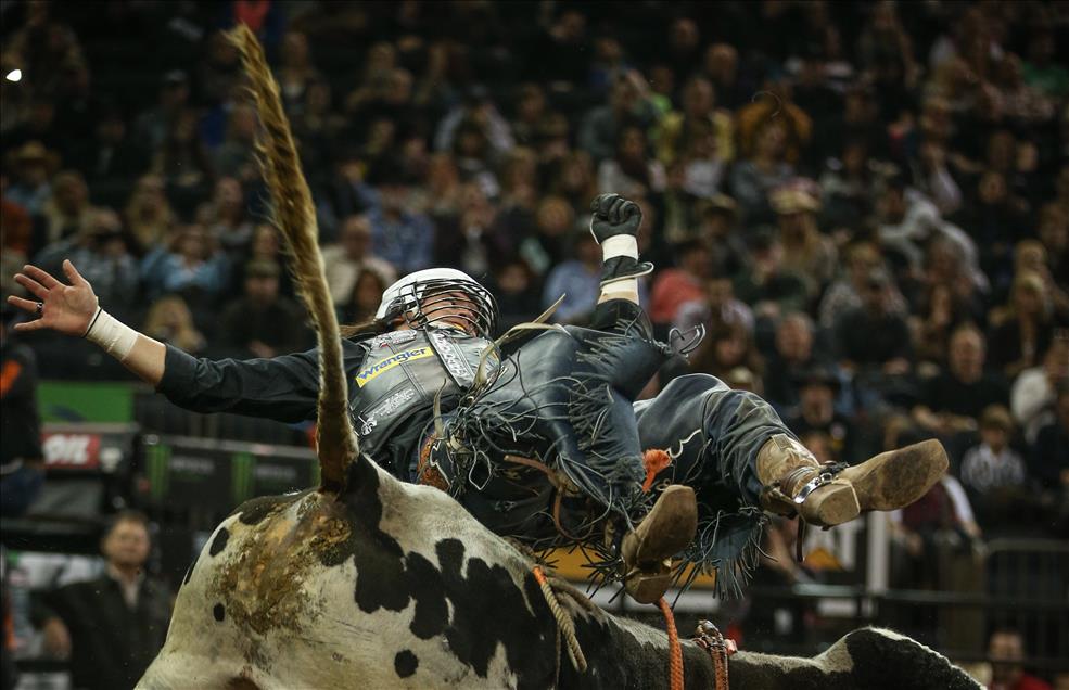 Amerika'nın önde gelen rodeocularını bir araya getiren Profesyonel Boğa Binicileri (PBR) liginin New York ayağı Madison Square Garden'da gerçekleşen son gün müsabakalarıyla tamamlandı. Dünya sıralamasında en üstte yer alan 15 ismin, yaklaşık 900 kilogram ağırlığındaki boğaların üzerinde 8 saniyeden uzun süre kalabilmek için mücadele ettiği müsabakalar nefes kesen anlara sahne oldu. ( Cem Özdel - AA )Cem Özdel