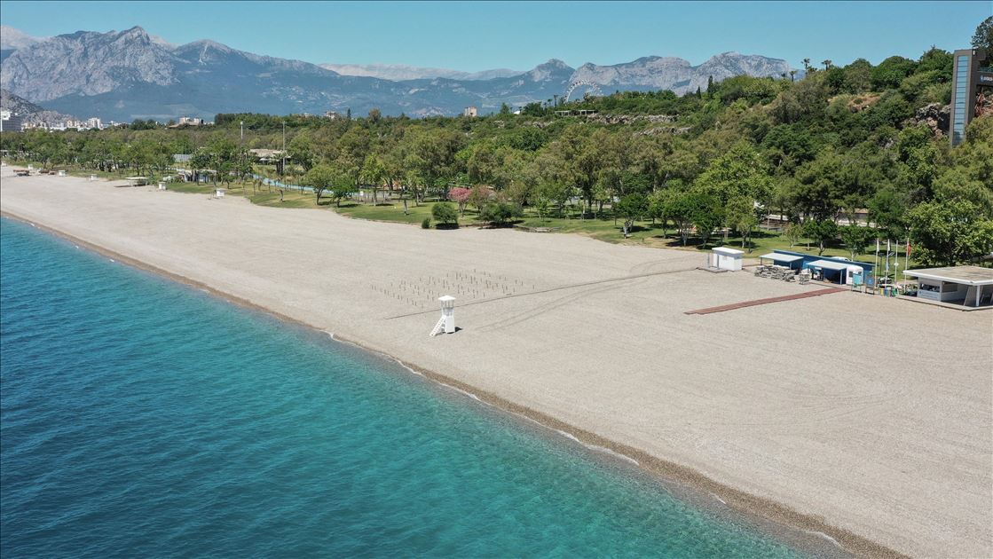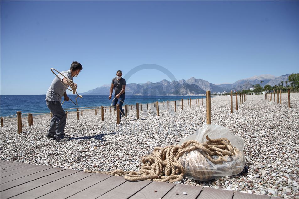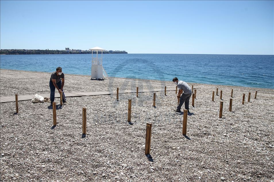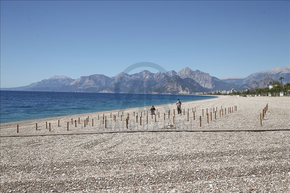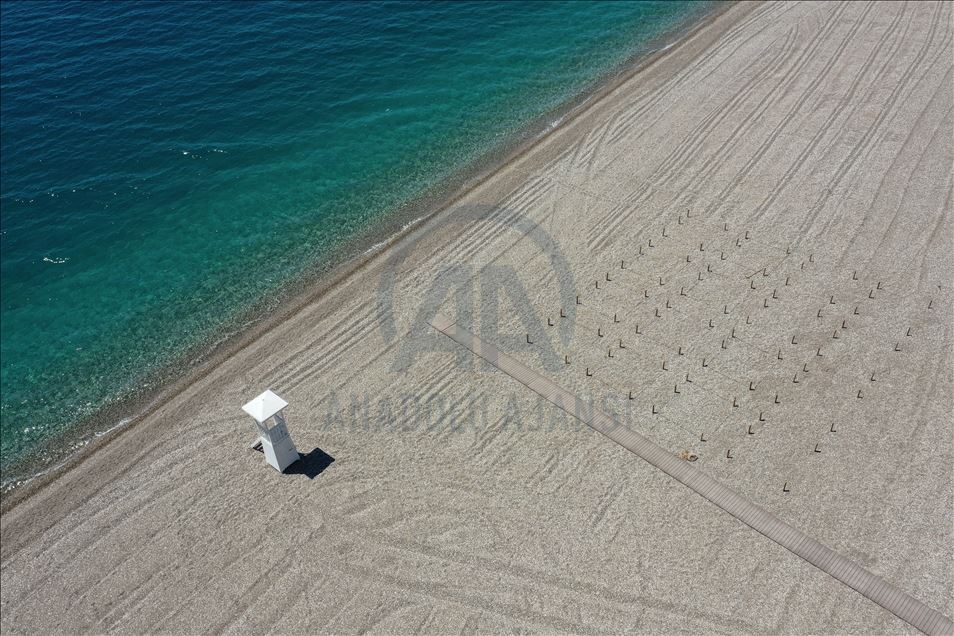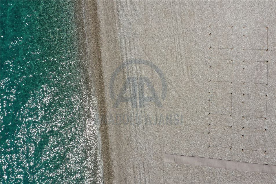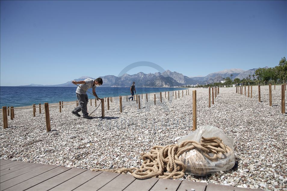 Antalya'nın dünyaca ünlü Konyaaltı sahili, denize girip plajda güneşlenecek yerli ve yabancı turistler için yeni tip koronavirüs (Kovid-19) tedbirlerine uygun olarak düzenleniyor.