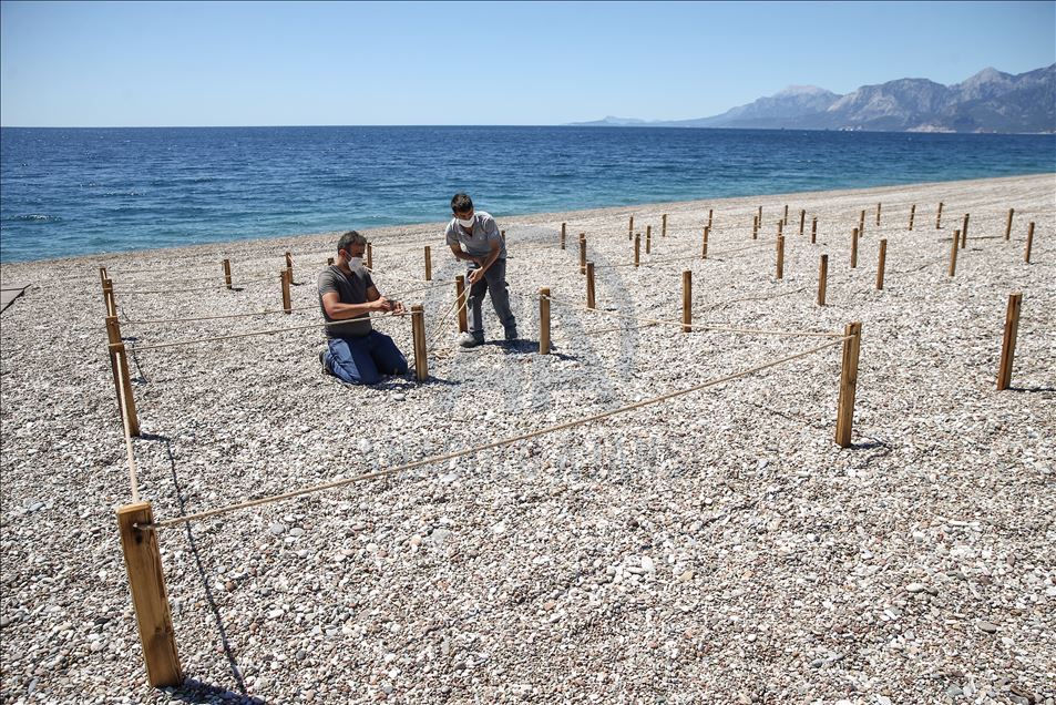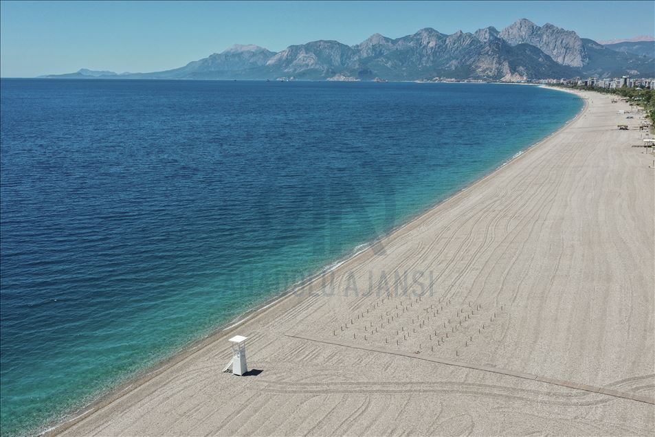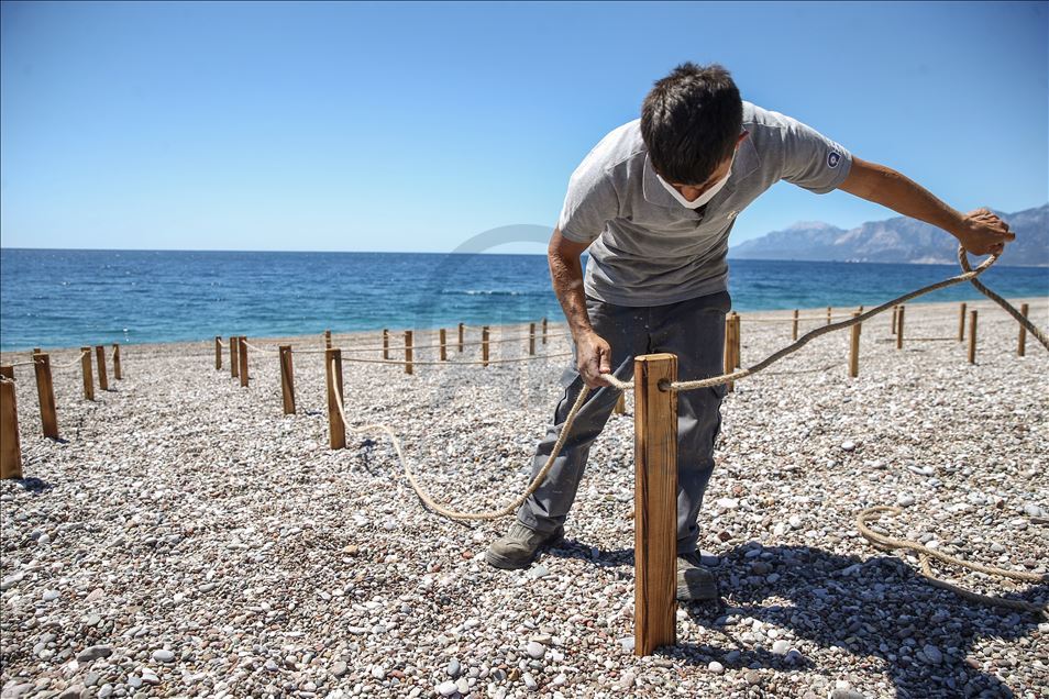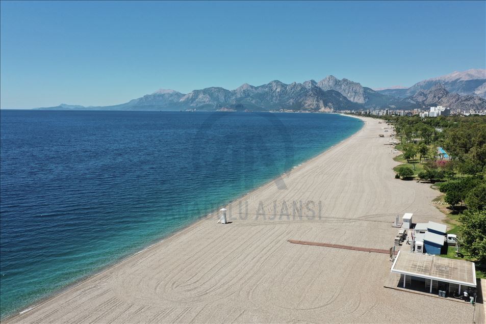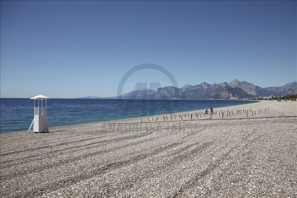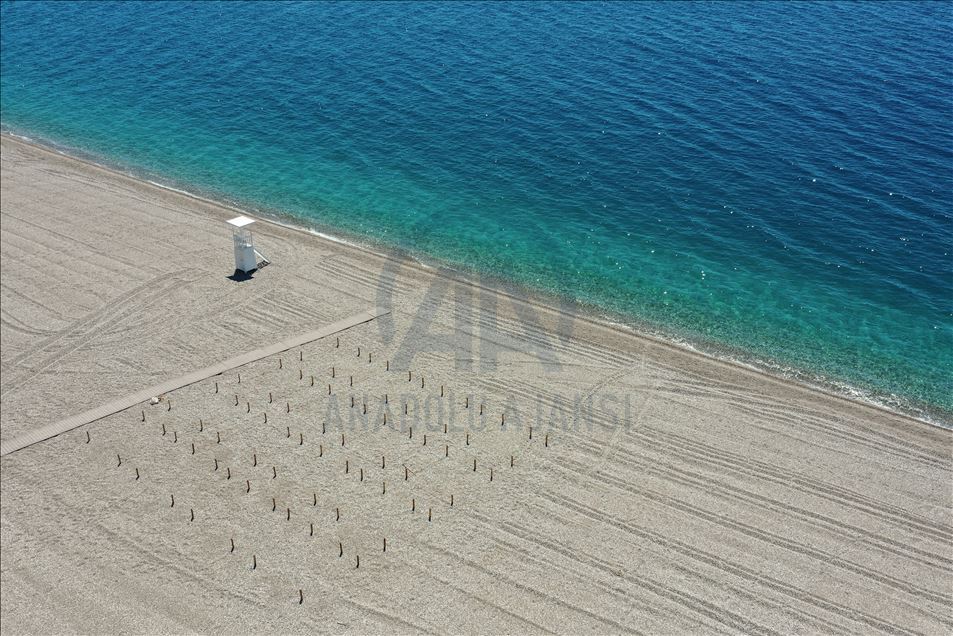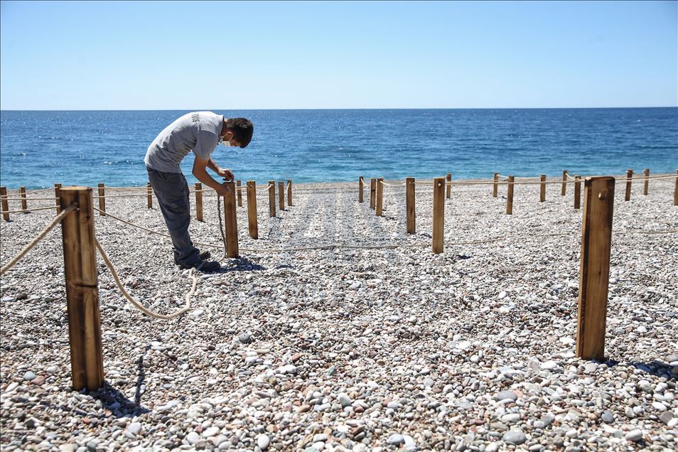 Antalya'nın dünyaca ünlü Konyaaltı sahili, denize girip plajda güneşlenecek yerli ve yabancı turistler için yeni tip koronavirüs (Kovid-19) tedbirlerine uygun olarak düzenleniyor.