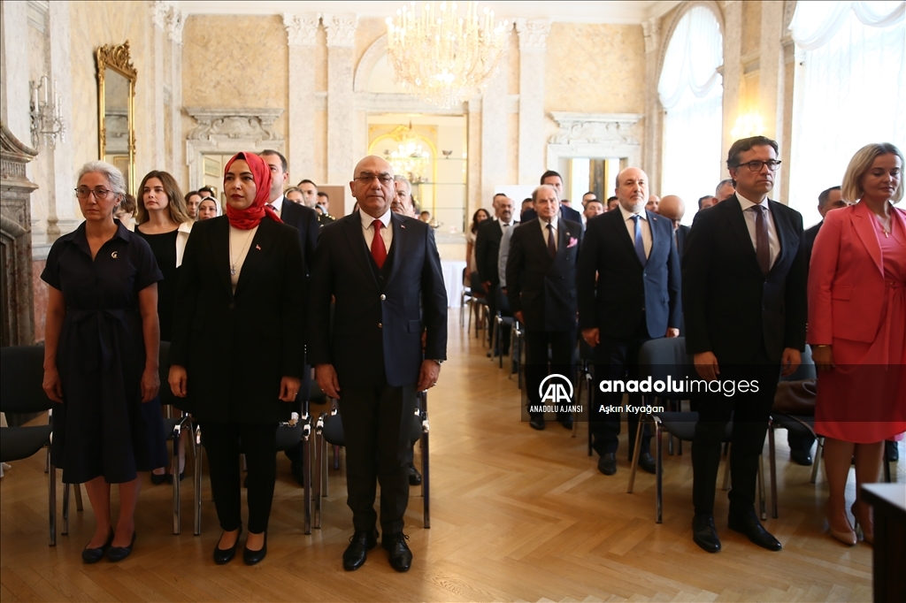 Türkiye’nin Viyana Büyükelçiliğinde, 30 Ağustos Zafer Bayramı’nın 102’nci yılı ve Türk Silahlı Kuvvetleri Günü vesilesiyle kutlama programı düzenlendi. Programa, Türkiye’nin Viyana Büyükelçisi Ozan Ceyhun (sol3), Türkiye’nin Birleşmiş Milletler (BM) Viyana Ofisi Nezdinde Daimi Temsilcisi Büyükelçi Levent Eler (sağ2), Türkiye’nin Avrupa Güvenlik ve İşbirliği Teşkilatı (AGİT) Daimi Temsilcisi Hatun Demirer’in (sol1) yanı sıra davetliler katıldı. (Aşkın Kıyağan - Anadolu Ajansı)Aşkın Kıyağan