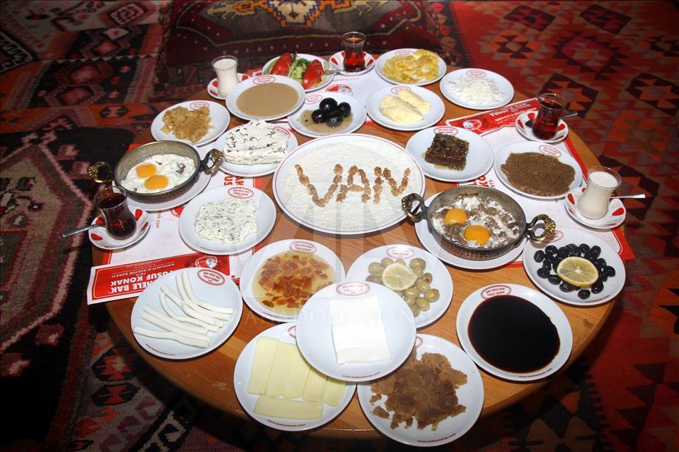Yöreye özgü 20 farklı ürünle hem göze hem de mideye hitap eden Van kahvaltısı, yerli ve yabancı misafirlerin ilgi odağı olmayı sürdürüyor. Özel hazırlanması dolayısıyla damakta tat bırakan Van kahvaltısı, sunulan zengin çeşitlerle de kenti ziyaret edenlerin hafızalarında uzun süre yerini alıyor. Kahvaltının hazırlanması için erken saatlerde mutfağa geçen ustalar, "Van çöreği", bölgede yetişen endemik bitkilerin karışımıyla yapılan "otlu peynir", yüksek rakımlı yaylalardan elde edilen "karakovan balı", un, tereyağı ve yumurtanın karışımıyla oluşan "murtuğa" ve bölgeye özgü tereyağında kavrulan ve öğütülmüş buğdayla hazırlanan "kavut" gibi 20 çeşit ürünün yer aldığı Van kahvaltısını konuklarına servis ediyor. Kentteki kahvaltı merkezlerinde yılların birikimine sahip ustalarca yöreye özgü ürünlerle hazırlanan kahvaltı, kenti ziyaret eden yerli ve yabancı misafirlerin vazgeçilmezleri arasından yer alıyor. ( Mesut Varol - Anadolu Ajansı )Mesut Varol